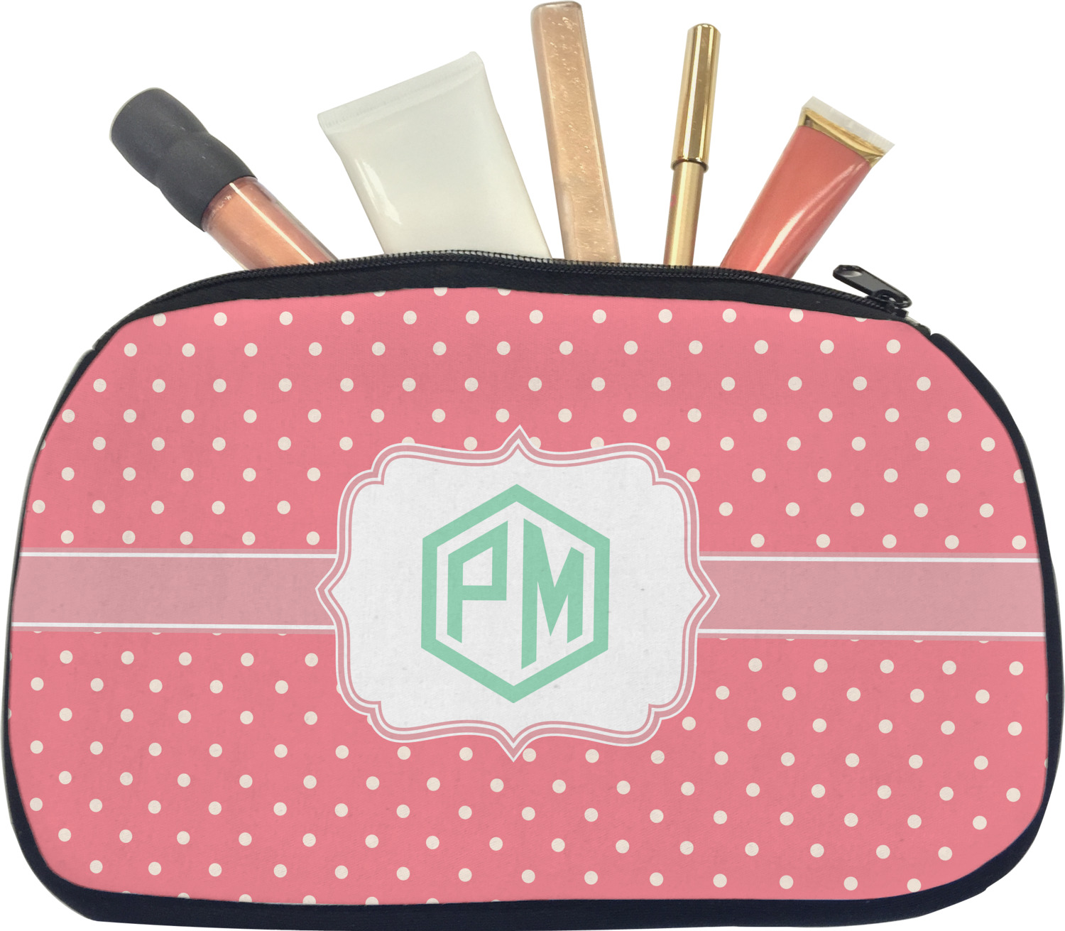 Our personalized makeup bags are available in many different designs, patterns and colors - so you are sure to find one that will love. They are made of neoprene (same material as wet-suits) and thus are water resistant, so spillages in your makeup bag will not end up all over you purse. They are customized on one side and are black on the other side and the zipper is black as well.