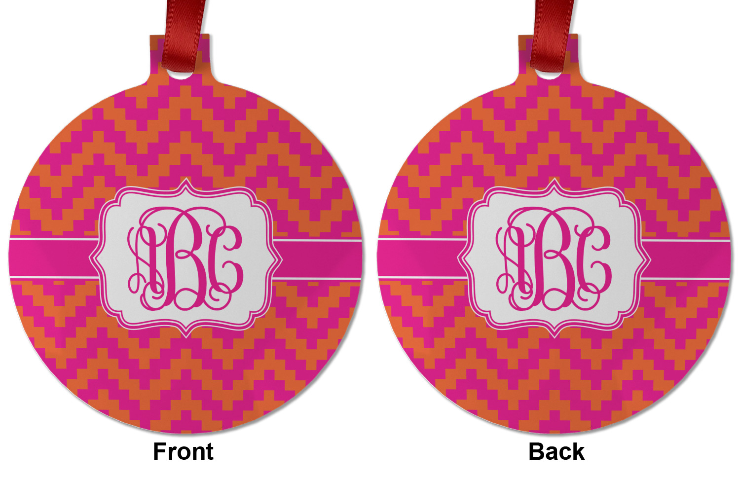 The pixelated chevron stripe pattern alternates between the hot pink and orange. The design has a classic ribbon in hot pink with white stripes. The decorative rectangular label is also in hot pink and white. The personalization is the gorgeous interlocking monogram in hot pink to pull the entire design together.