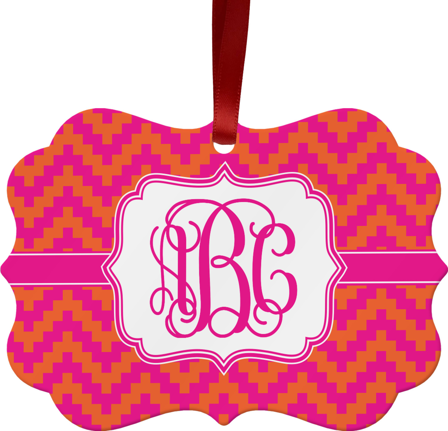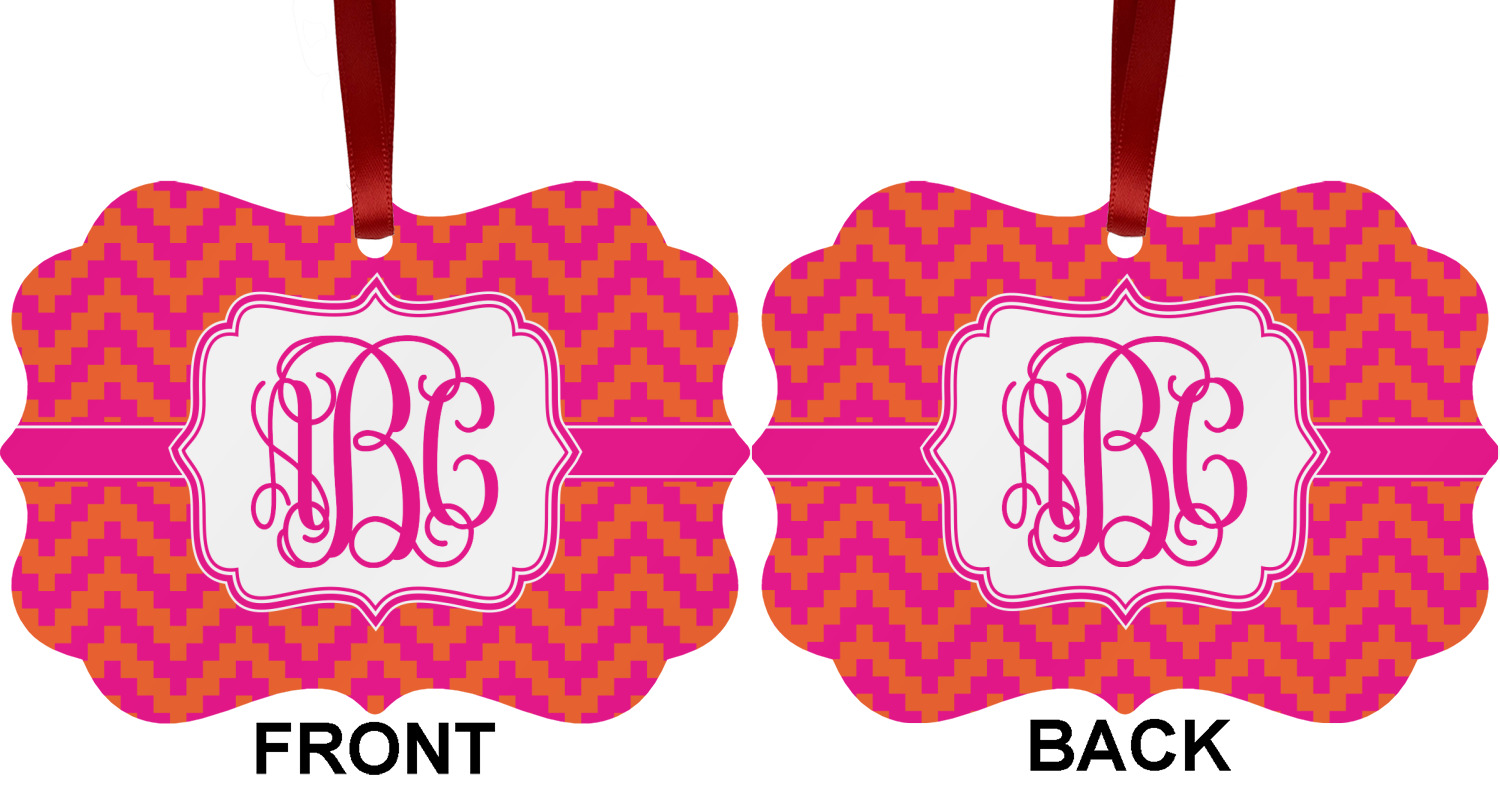The pixelated chevron stripe pattern alternates between the hot pink and orange. The design has a classic ribbon in hot pink with white stripes. The decorative rectangular label is also in hot pink and white. The personalization is the gorgeous interlocking monogram in hot pink to pull the entire design together.