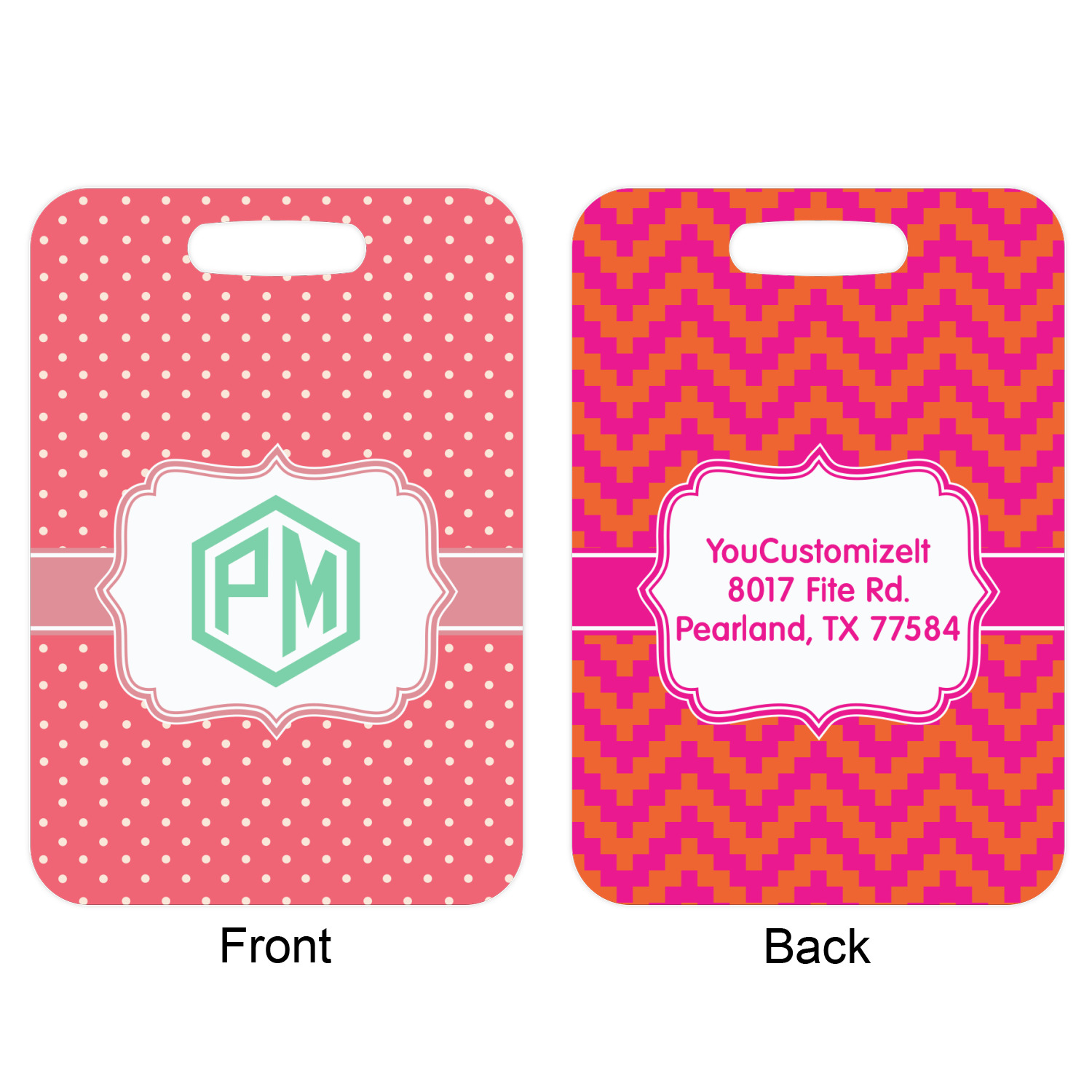These metal luggage tags are printed on both sides; the front is printed with the design of your choice - and can be personalized with your name, name & initial or your monogram. The back can have as much or as little of your contact information as you desire - your name, your address, city, zip & state, you can also include your phone number and email address. Customize it exactly the way you want it!