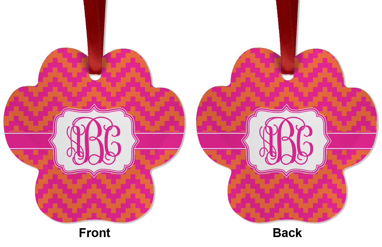 The pixelated chevron stripe pattern alternates between the hot pink and orange. The design has a classic ribbon in hot pink with white stripes. The decorative rectangular label is also in hot pink and white. The personalization is the gorgeous interlocking monogram in hot pink to pull the entire design together.