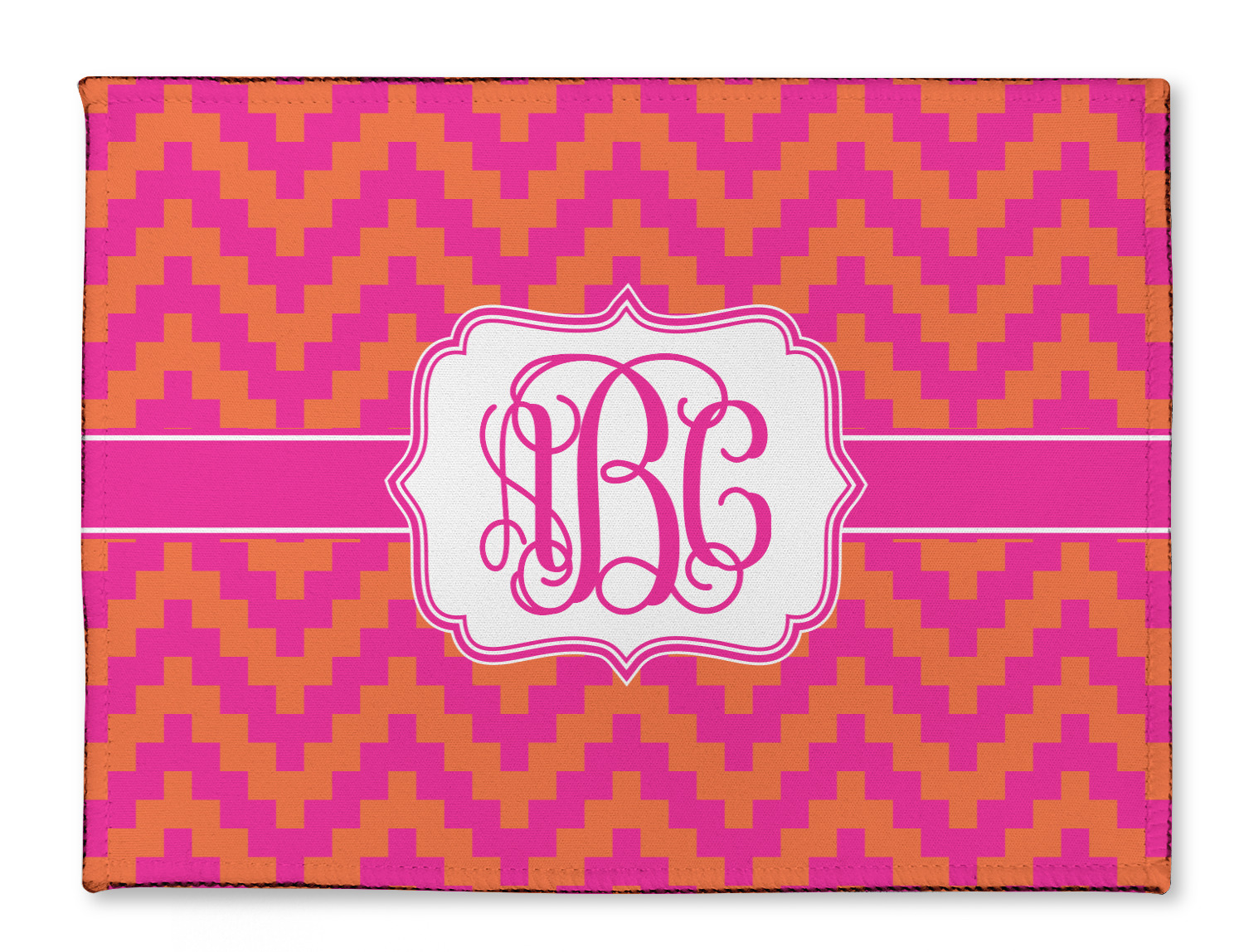 The pixelated chevron stripe pattern alternates between the hot pink and orange. The design has a classic ribbon in hot pink with white stripes. The decorative rectangular label is also in hot pink and white. The personalization is the gorgeous interlocking monogram in hot pink to pull the entire design together.