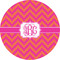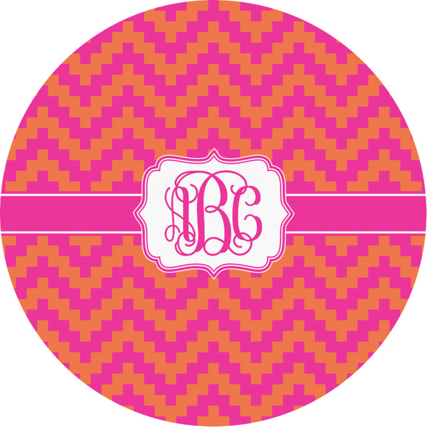 The pixelated chevron stripe pattern alternates between the hot pink and orange. The design has a classic ribbon in hot pink with white stripes. The decorative rectangular label is also in hot pink and white. The personalization is the gorgeous interlocking monogram in hot pink to pull the entire design together.