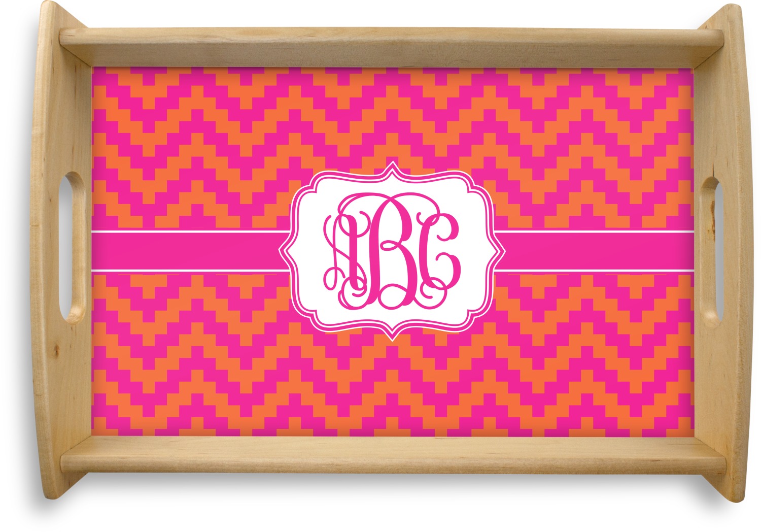 The pixelated chevron stripe pattern alternates between the hot pink and orange. The design has a classic ribbon in hot pink with white stripes. The decorative rectangular label is also in hot pink and white. The personalization is the gorgeous interlocking monogram in hot pink to pull the entire design together.