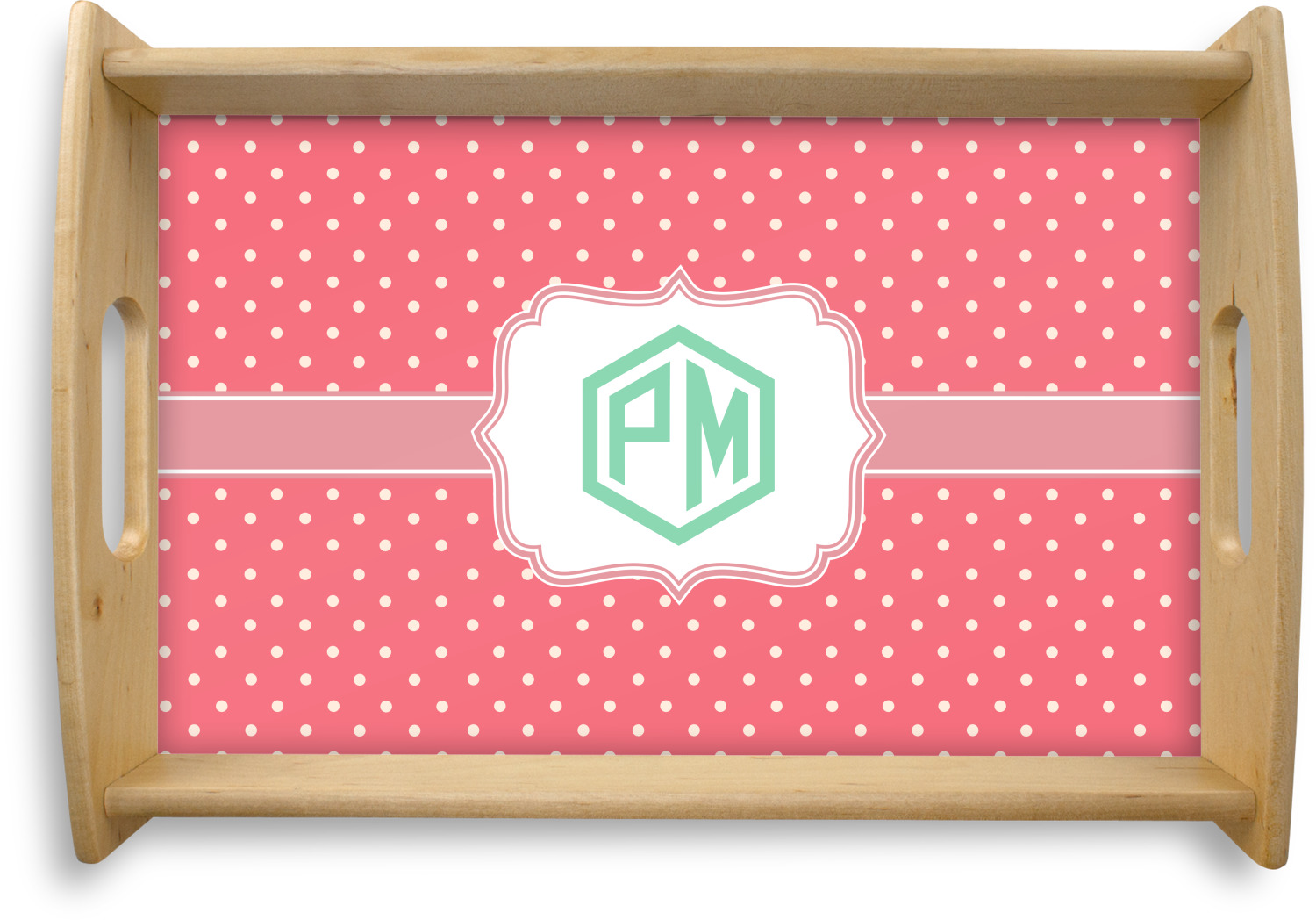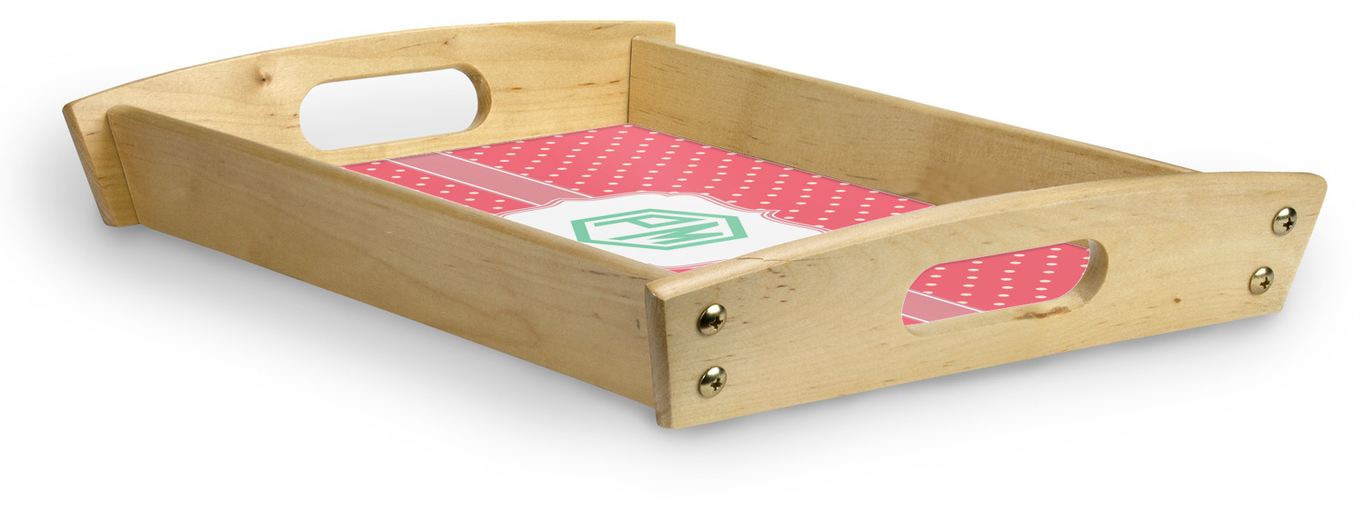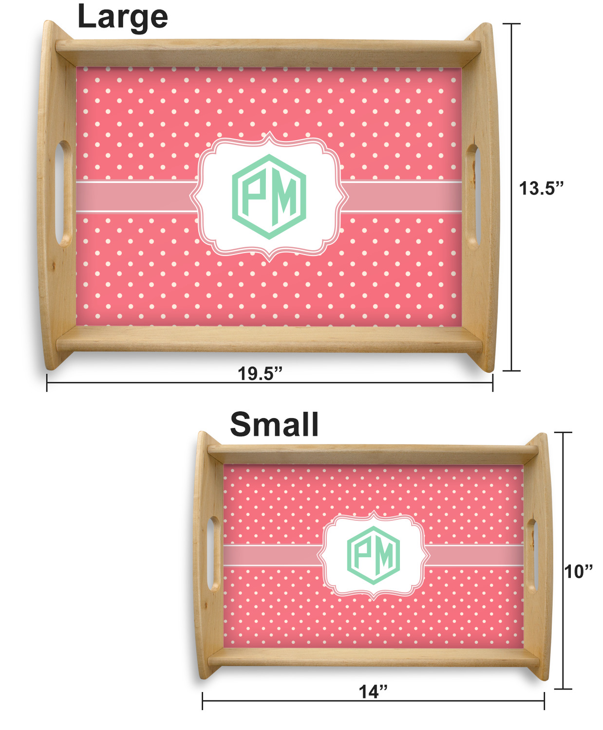 This serving tray with handles features square edges and two rounded sides, creating a very modern look. Each side is fabricated from a beautifully cut, natural wood. The bottom of the interior of the tray displays your customized design in bright, vibrant color. The tray is sold in both a black color and a natural wood look. Each variation of the wood serving tray has two sizes: Small, which is 14" x 10" x 2.25", and Large, which is 19.5" x 13.5" x 2.75".