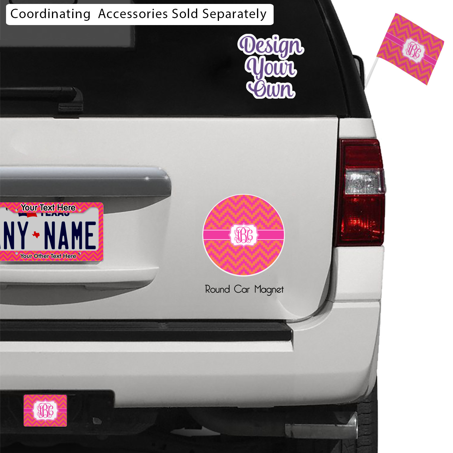 The pixelated chevron stripe pattern alternates between the hot pink and orange. The design has a classic ribbon in hot pink with white stripes. The decorative rectangular label is also in hot pink and white. The personalization is the gorgeous interlocking monogram in hot pink to pull the entire design together.