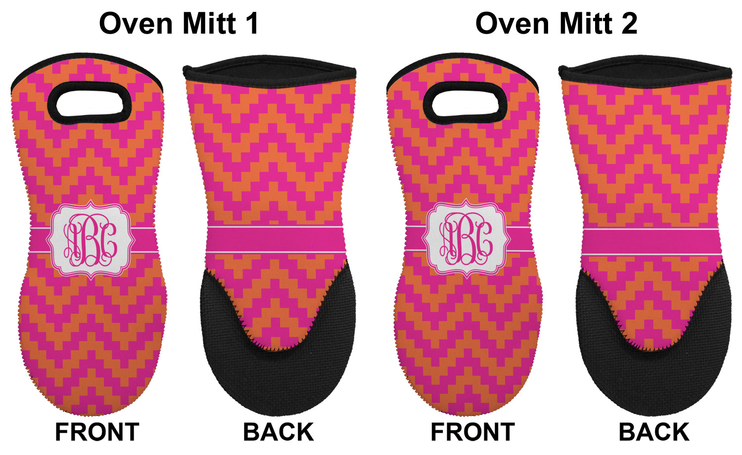 These heat resistant gloves are made entirely of a durable neoprene; the front features a softer texture, while the palm's side has a textured surface, meant to handle heat up to 500 degrees Fahrenheit. Thick, heavy duty stitching connects the two sides. A small, oval cutout appears on the front, and can be used to hang and store the mitt. Your personalization appears on the front, and the upper part of the back of the mitt. The style of these oven mitts are suitable for both the right and left hand, depending on your needs. If you need one for each hand, be sure to order two!