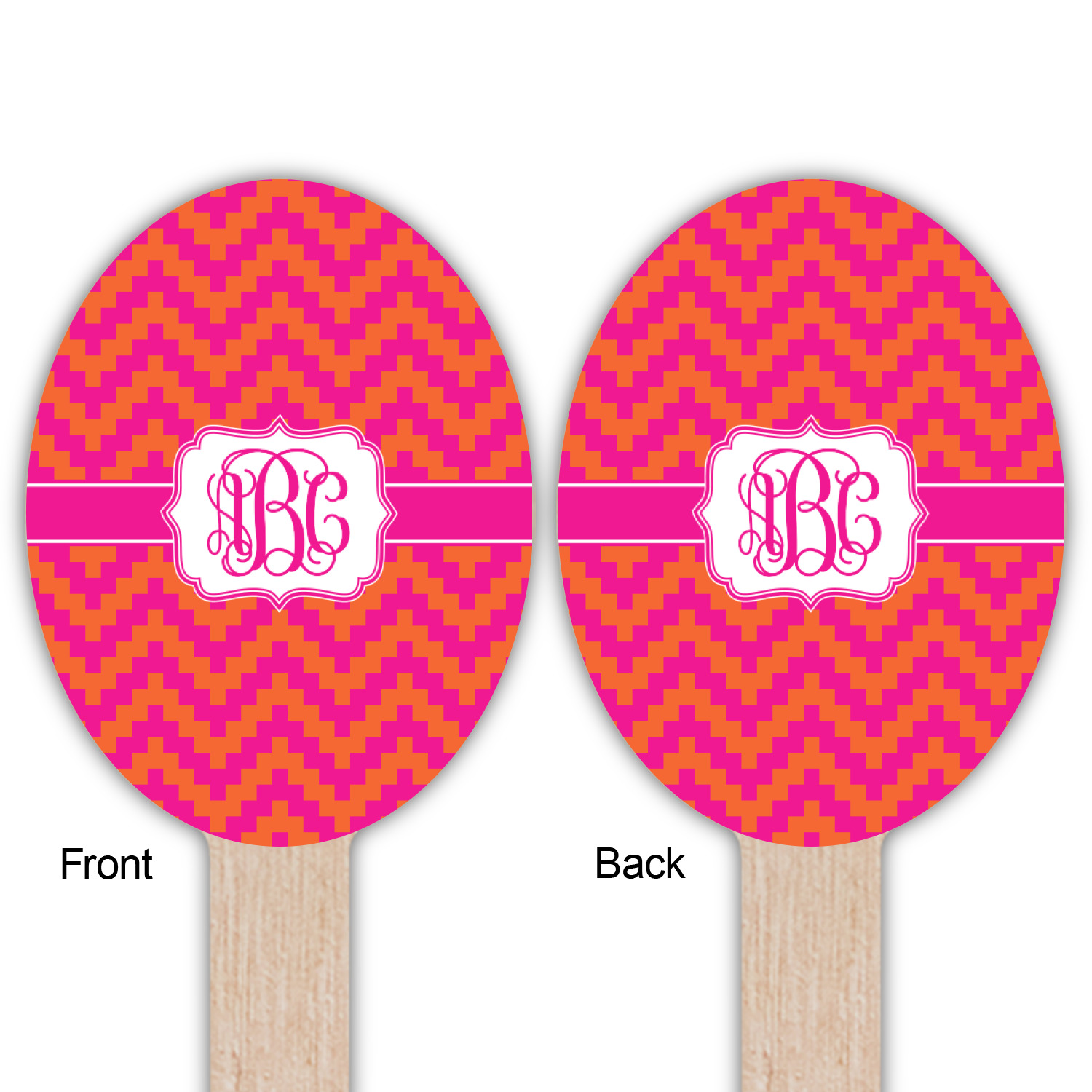 The pixelated chevron stripe pattern alternates between the hot pink and orange. The design has a classic ribbon in hot pink with white stripes. The decorative rectangular label is also in hot pink and white. The personalization is the gorgeous interlocking monogram in hot pink to pull the entire design together.