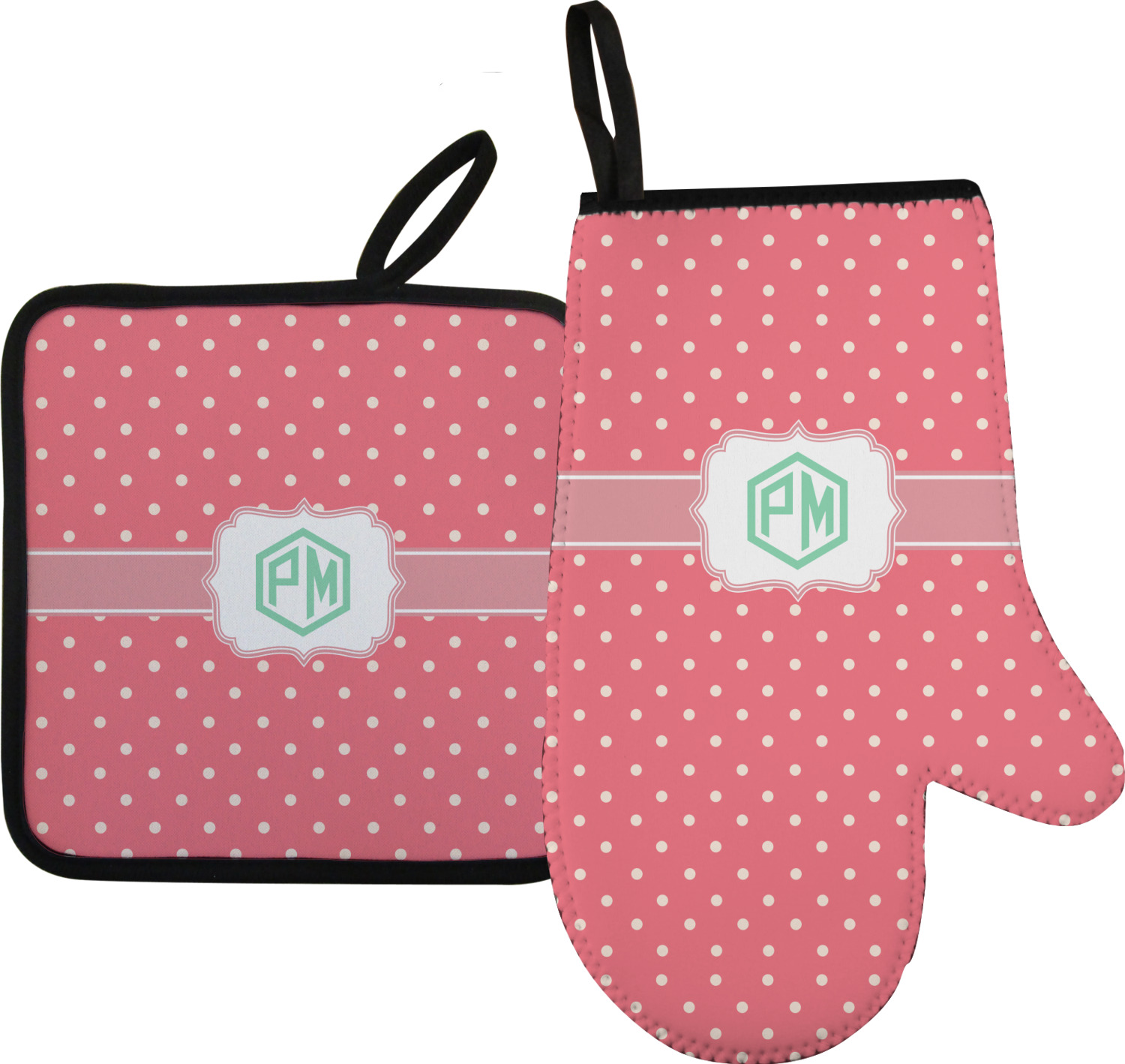 Along with our heat resistant gloves, we also carry personalized pot holders. These pot holders also feature a neoprene front that displays your personalization, and a textured, rubber backing for a sturdy grip. The two materials are connected with a sleek, black trim, and the hot pot holder also includes an attached loop for hanging and storage. You can purchase a kitchen pot holder by itself, or alongside a right or left oven mitt, depending on your needs. The pot holder itself is approximately 8.75 inches by 8.75 inches and 0.25 inches tall.