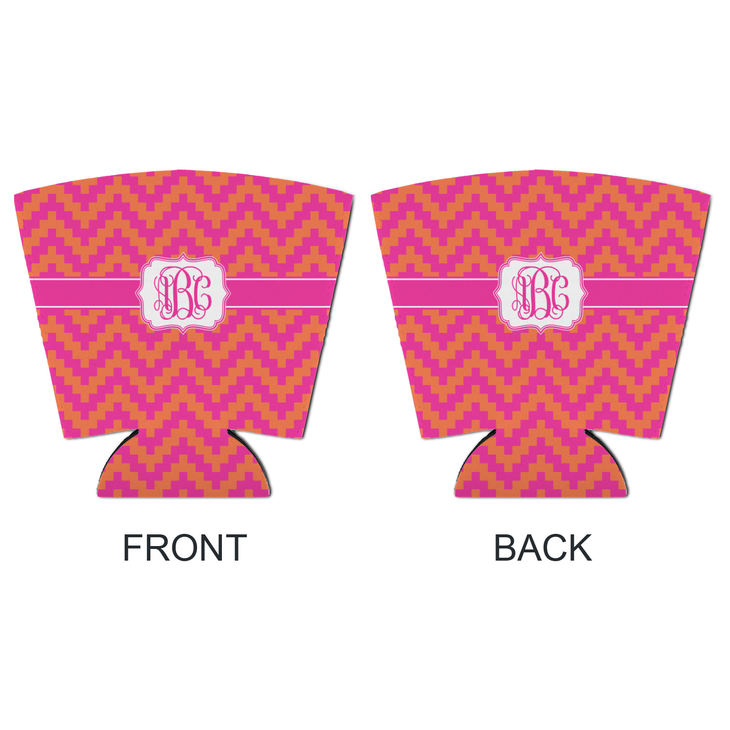The pixelated chevron stripe pattern alternates between the hot pink and orange. The design has a classic ribbon in hot pink with white stripes. The decorative rectangular label is also in hot pink and white. The personalization is the gorgeous interlocking monogram in hot pink to pull the entire design together.