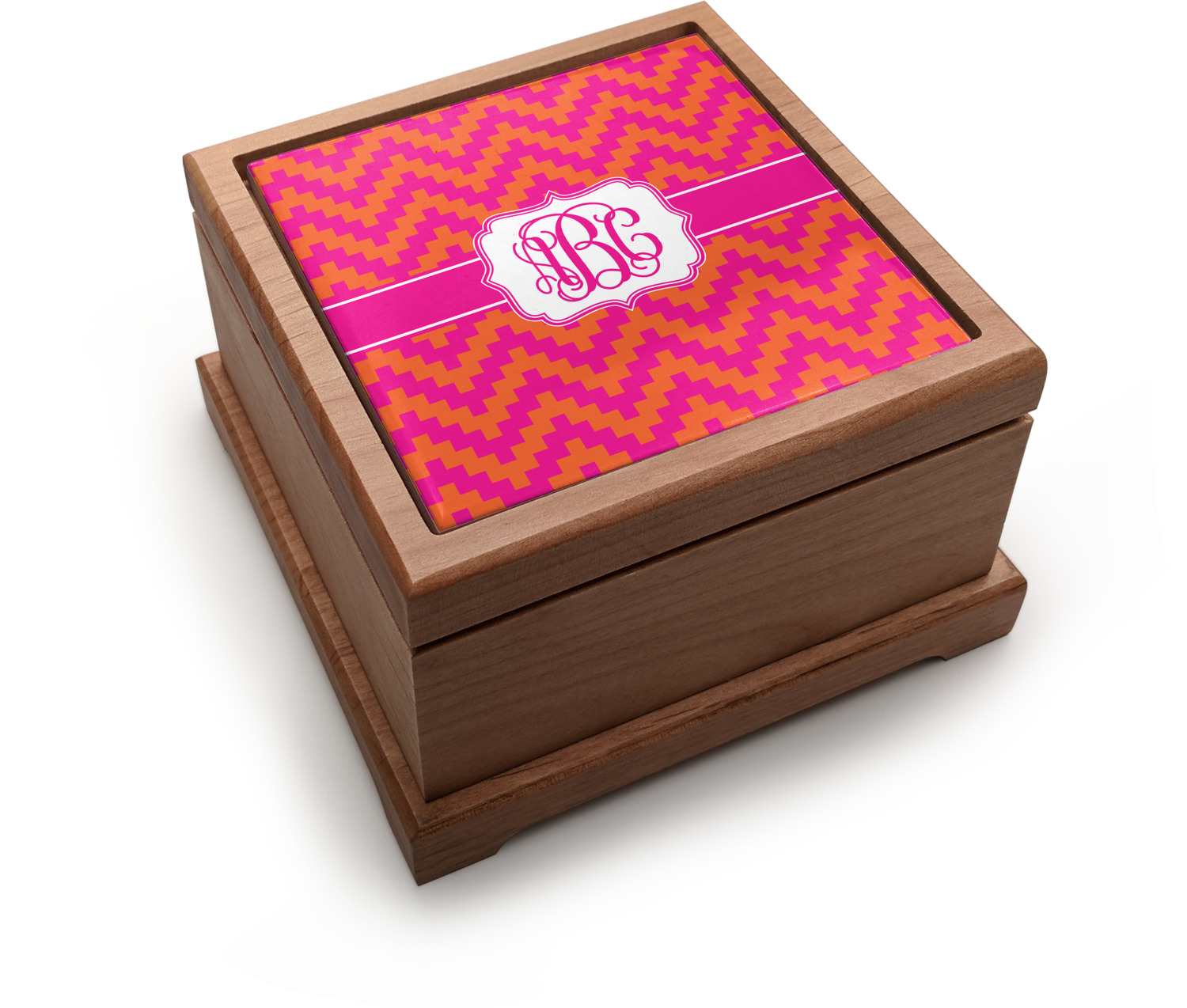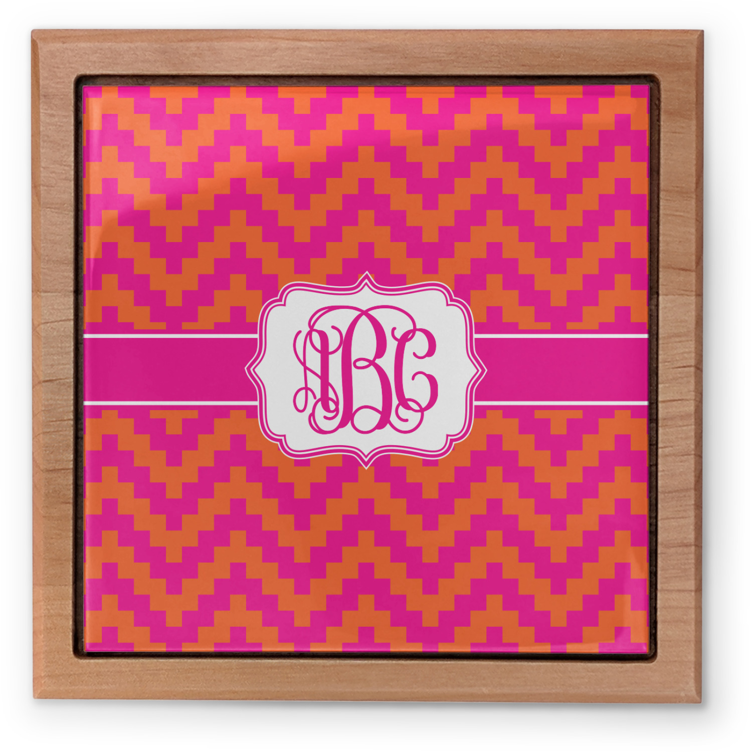 The pixelated chevron stripe pattern alternates between the hot pink and orange. The design has a classic ribbon in hot pink with white stripes. The decorative rectangular label is also in hot pink and white. The personalization is the gorgeous interlocking monogram in hot pink to pull the entire design together.