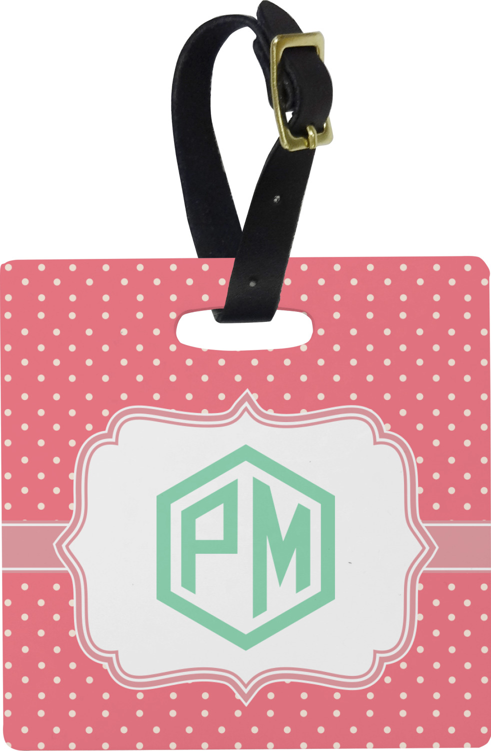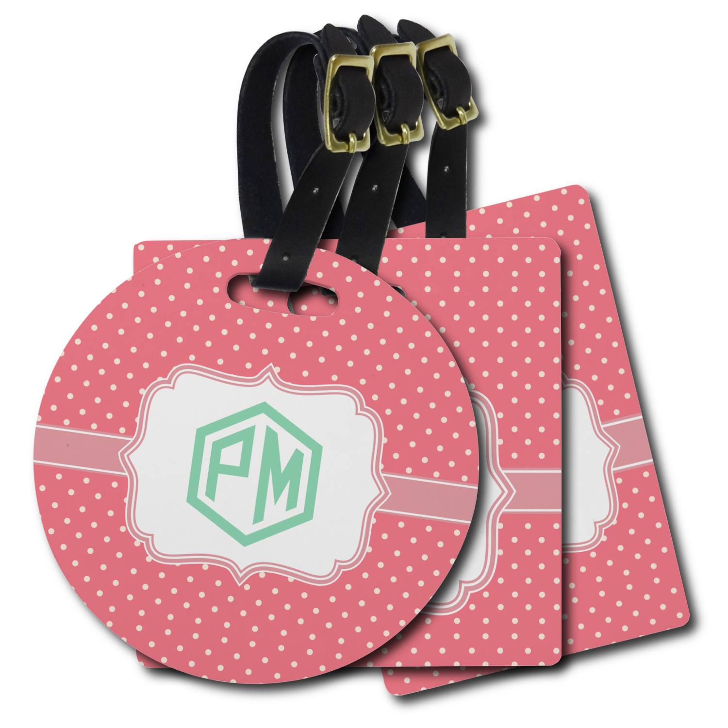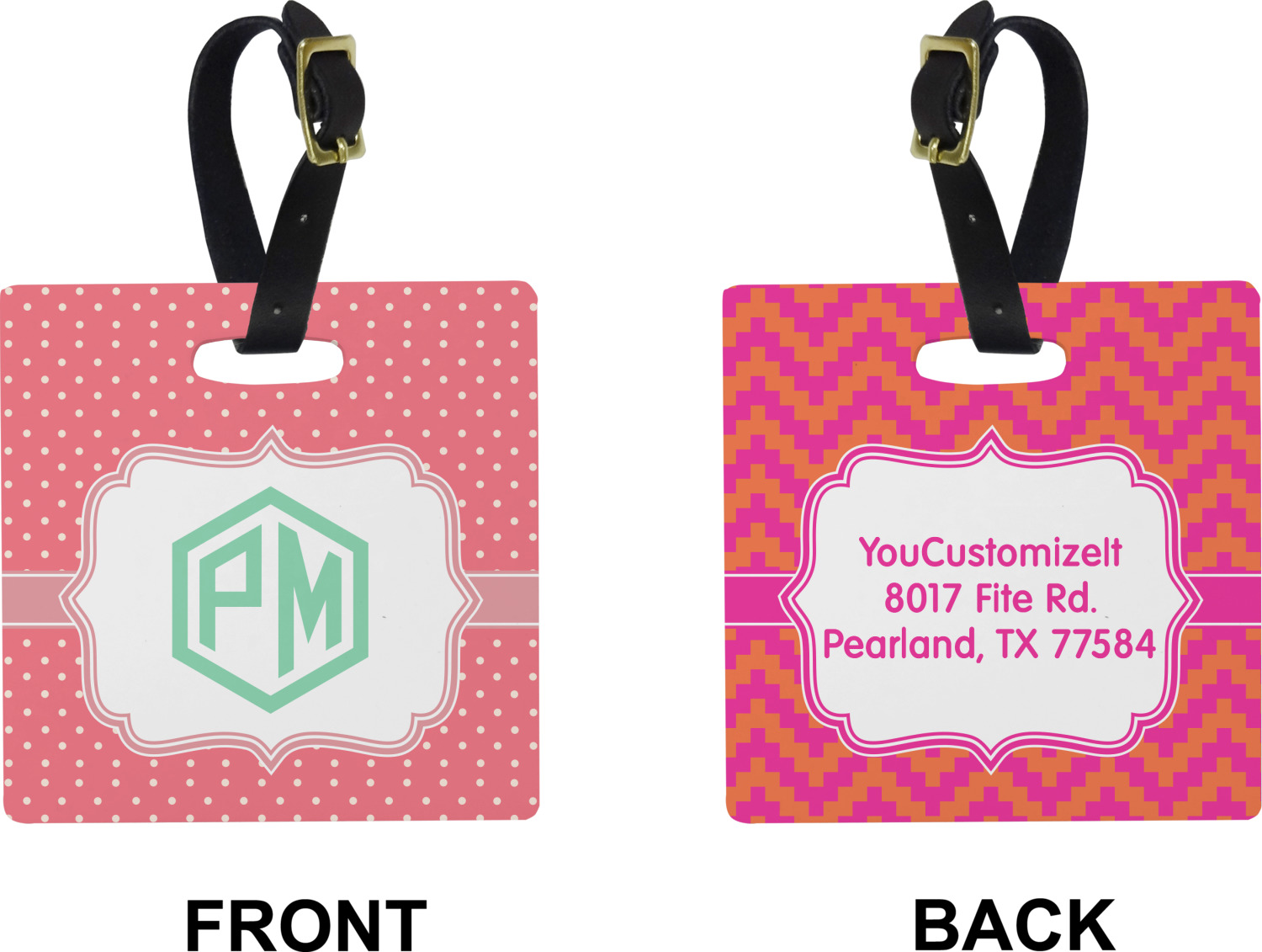 These personalized bag tags are sold in a variety of shapes, so that you may find the product that meets your vision exactly. We sell a round luggage tag, which measures at approximately 4" x 4". Our square luggage tag is about 3.5" x 3.5", while our rectangular version is 2.75" x 4 ".