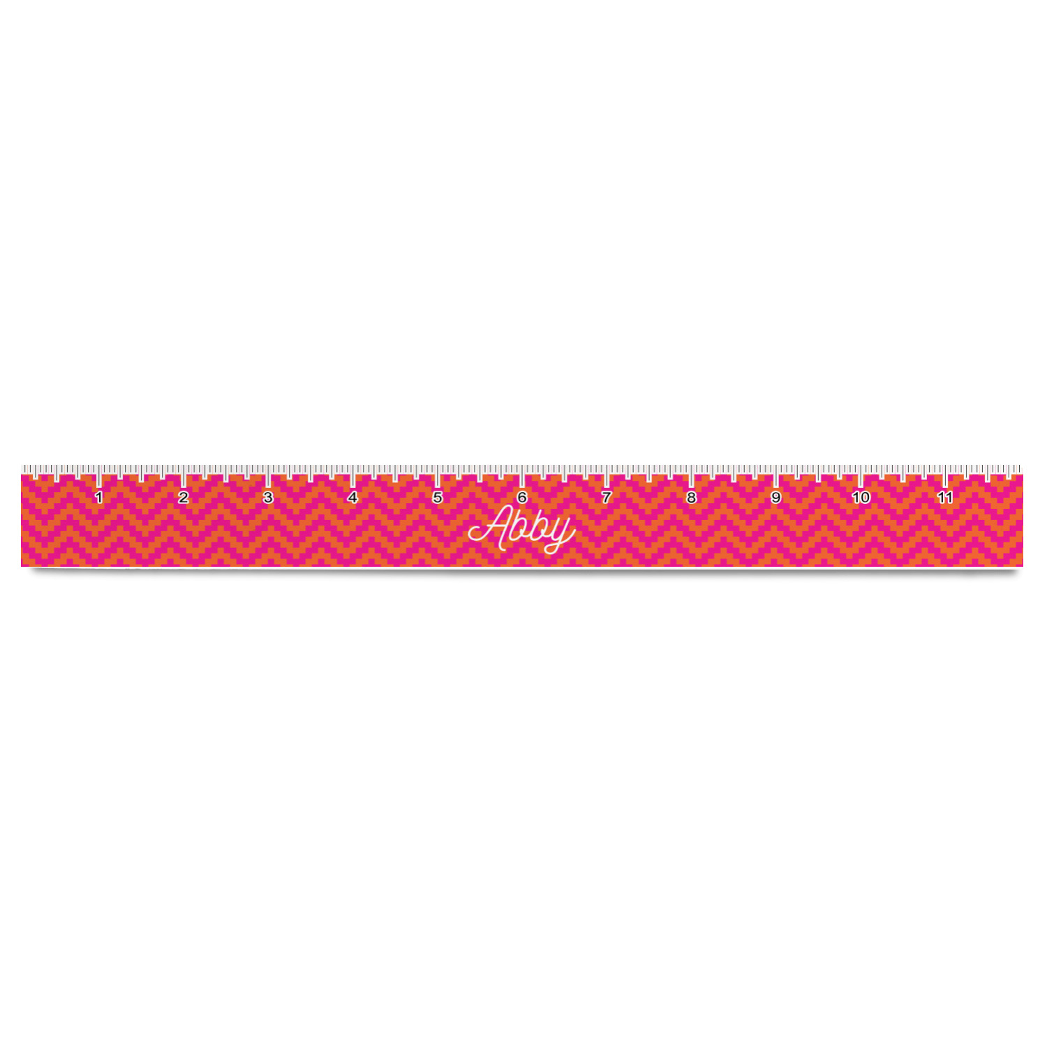 The pixelated chevron stripe pattern alternates between the hot pink and orange. The design has a classic ribbon in hot pink with white stripes. The decorative rectangular label is also in hot pink and white. The personalization is the gorgeous interlocking monogram in hot pink to pull the entire design together.