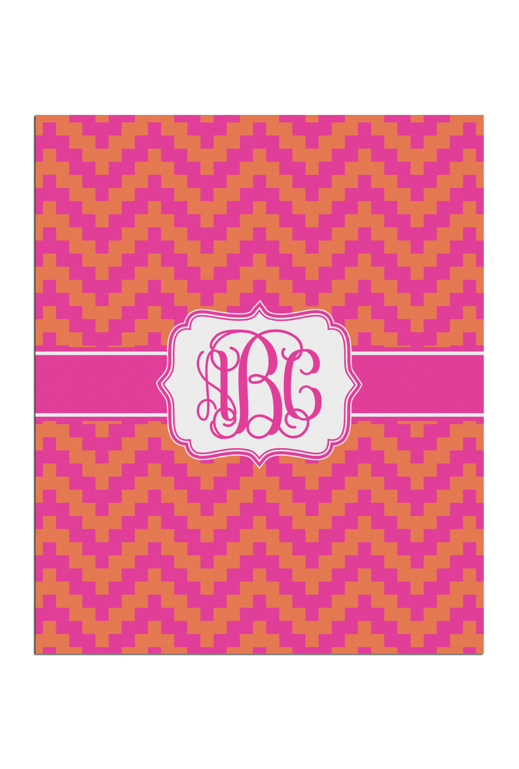 The pixelated chevron stripe pattern alternates between the hot pink and orange. The design has a classic ribbon in hot pink with white stripes. The decorative rectangular label is also in hot pink and white. The personalization is the gorgeous interlocking monogram in hot pink to pull the entire design together.