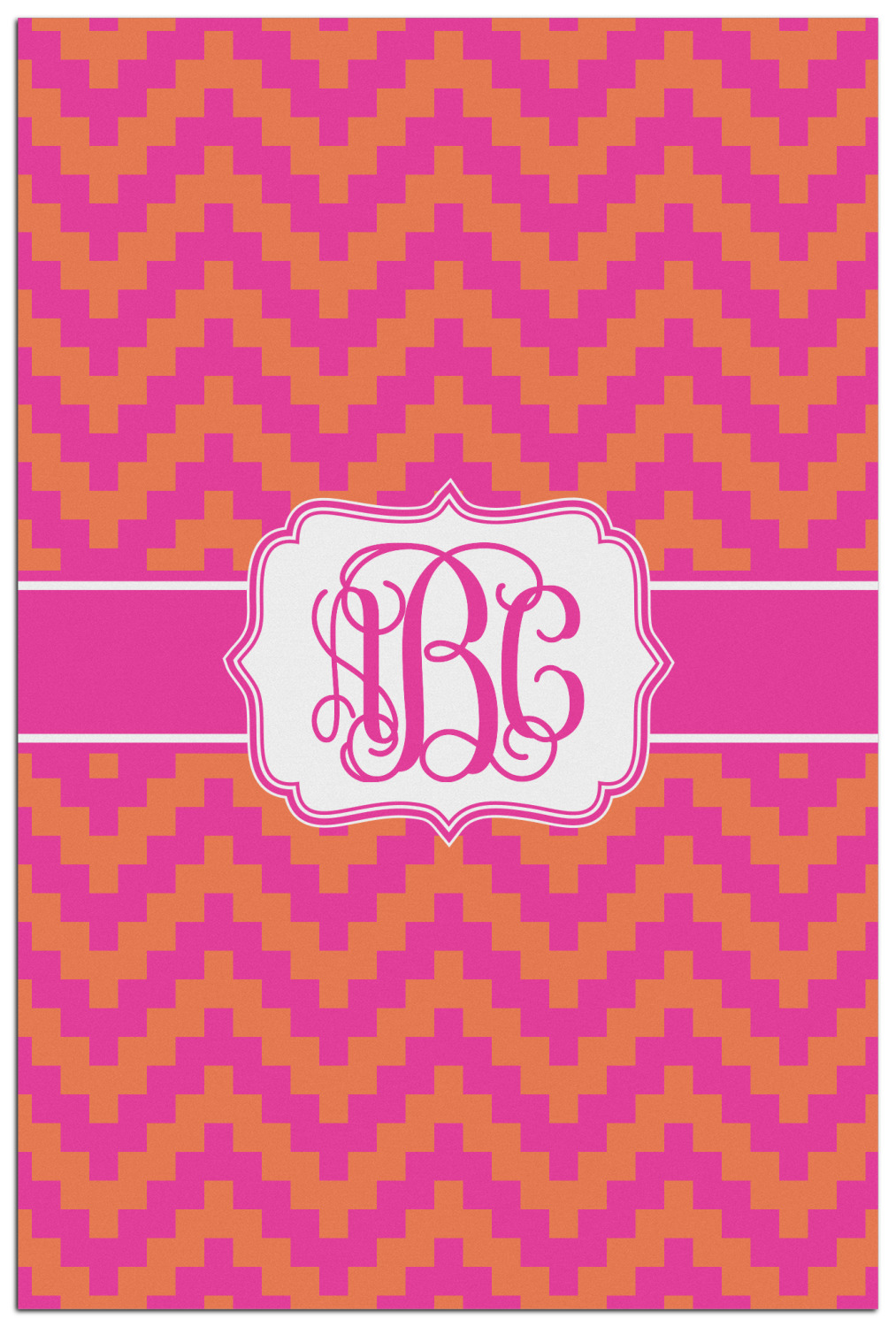 The pixelated chevron stripe pattern alternates between the hot pink and orange. The design has a classic ribbon in hot pink with white stripes. The decorative rectangular label is also in hot pink and white. The personalization is the gorgeous interlocking monogram in hot pink to pull the entire design together.