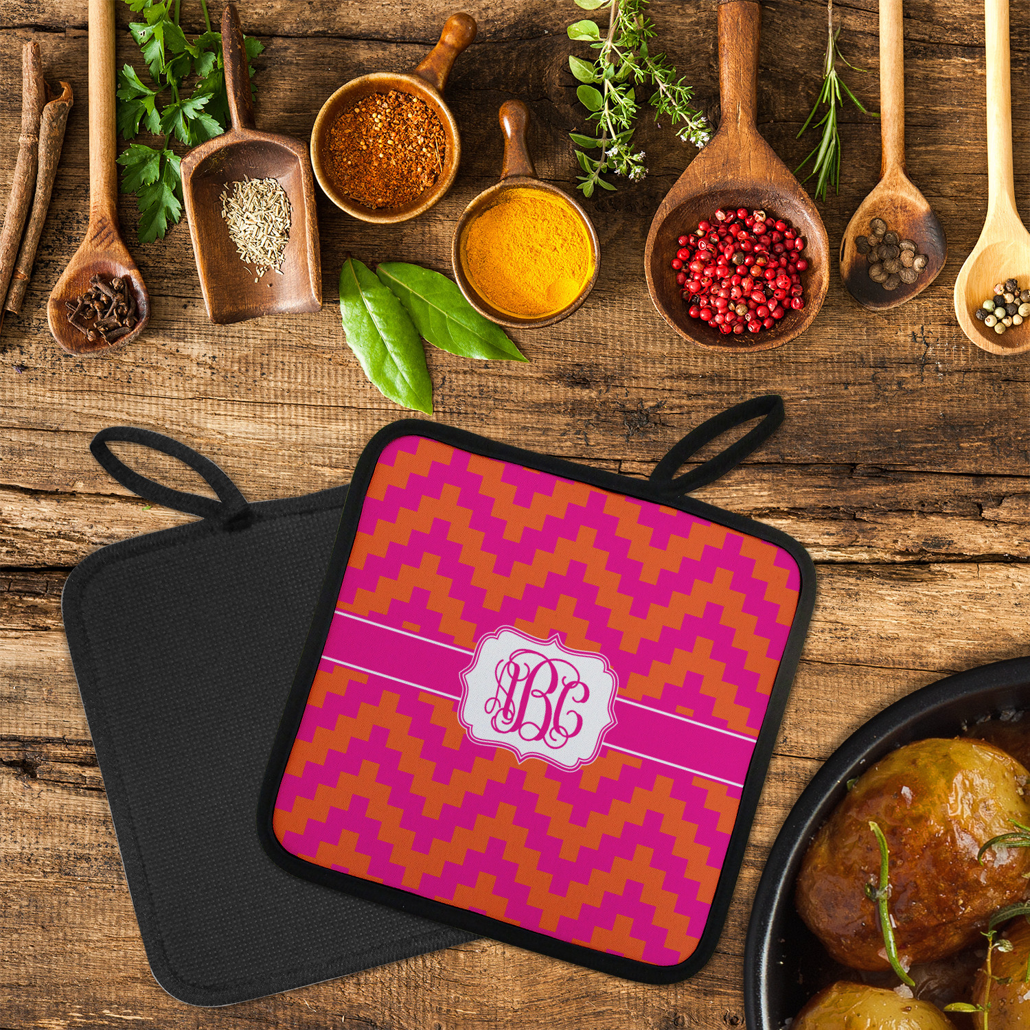 Our personalized pot holders feature a neoprene front that displays your personalization in vibrant colors. The backing of the hot pot holder is rubberized; the textured backing allows you to have a great grip when using this custom pot holder. The two materials are joined with a sleek, black trim, and the holder also includes an attached loop for hanging and storage. The pot holder is approximately 8.75 inches by 8.75 inches and 0.25 inches tall, while the fabric loop is 2.5 inches long. You can purchase a kitchen pot holder by itself or as a set of 2. We also offer a set including one pot holder and one oven mitt.