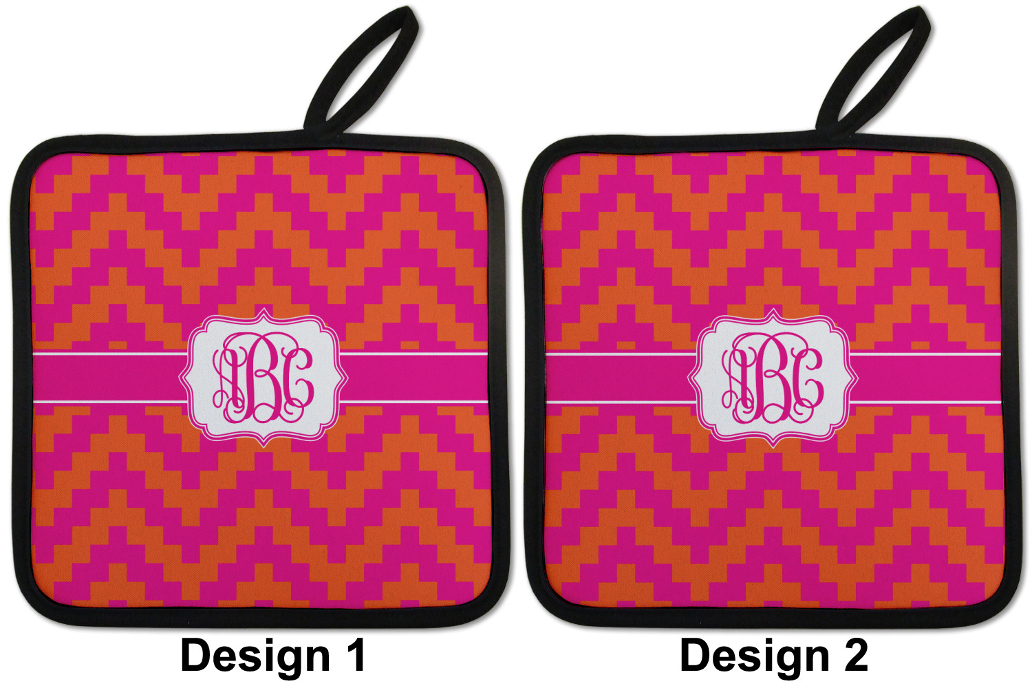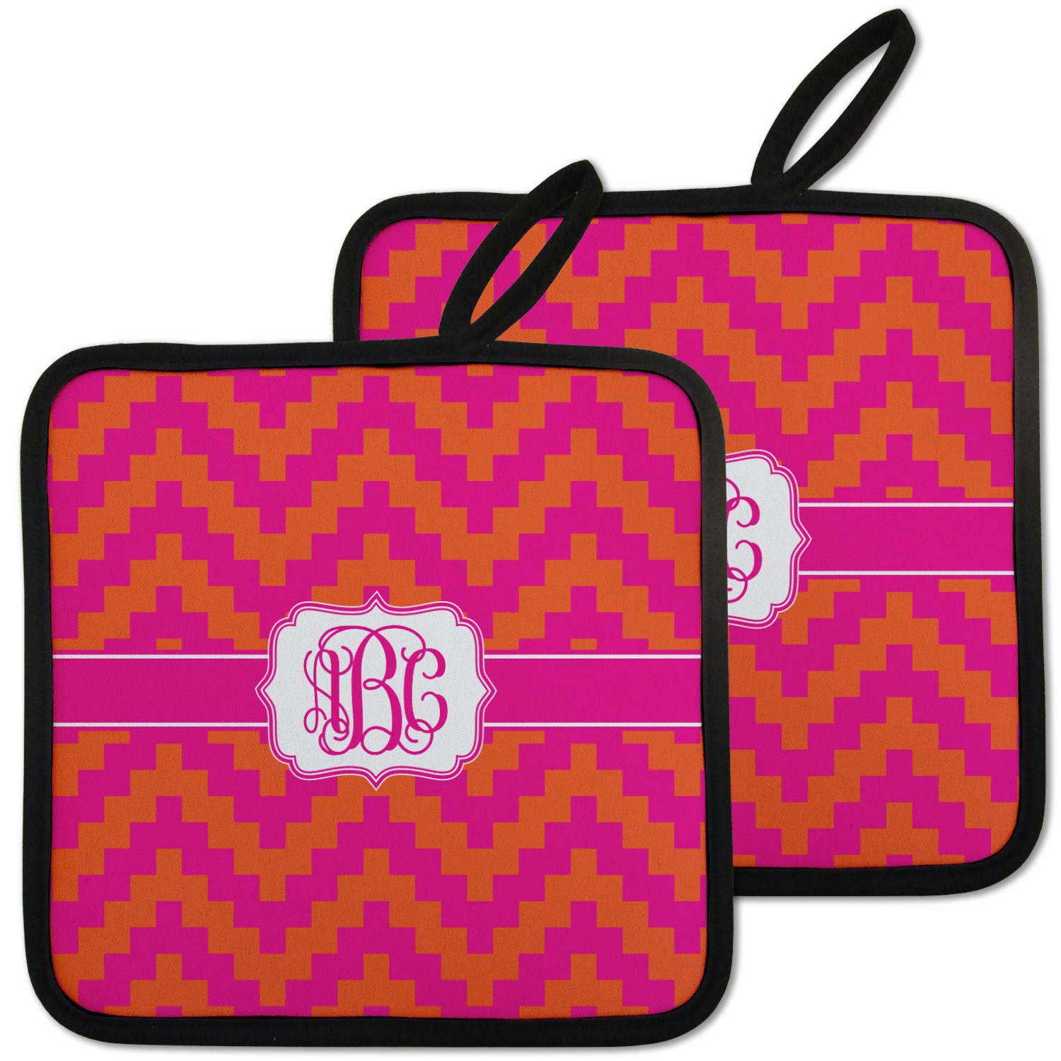 The pixelated chevron stripe pattern alternates between the hot pink and orange. The design has a classic ribbon in hot pink with white stripes. The decorative rectangular label is also in hot pink and white. The personalization is the gorgeous interlocking monogram in hot pink to pull the entire design together.