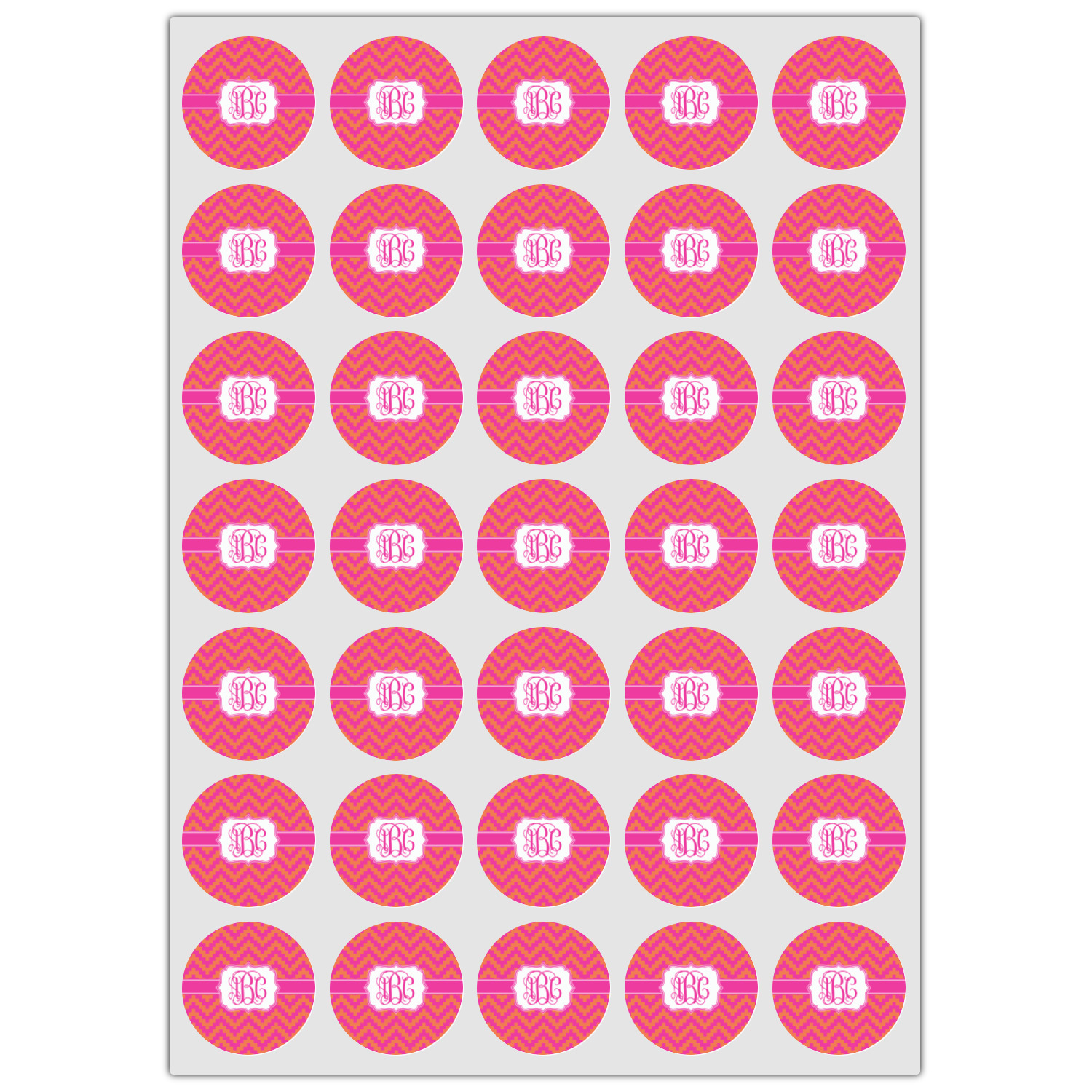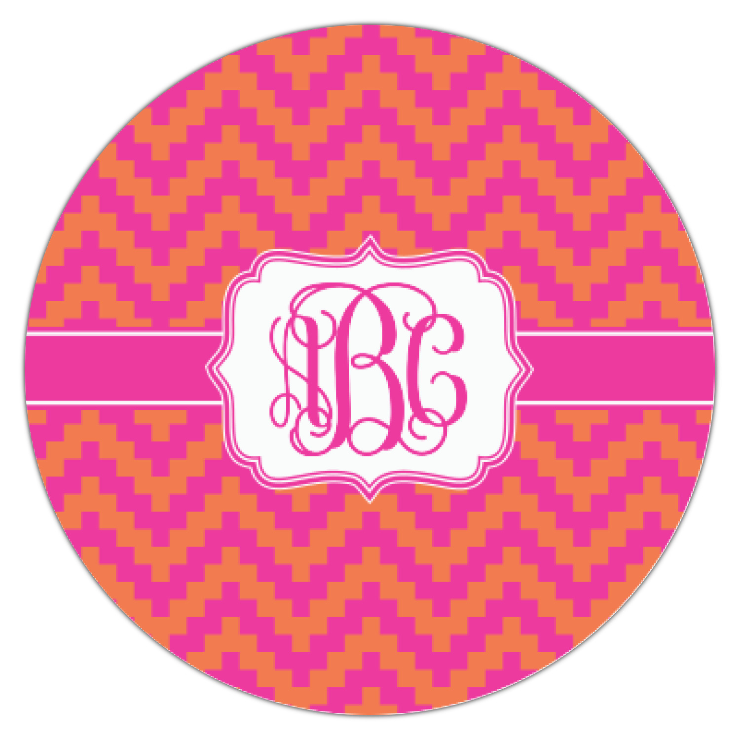 The pixelated chevron stripe pattern alternates between the hot pink and orange. The design has a classic ribbon in hot pink with white stripes. The decorative rectangular label is also in hot pink and white. The personalization is the gorgeous interlocking monogram in hot pink to pull the entire design together.