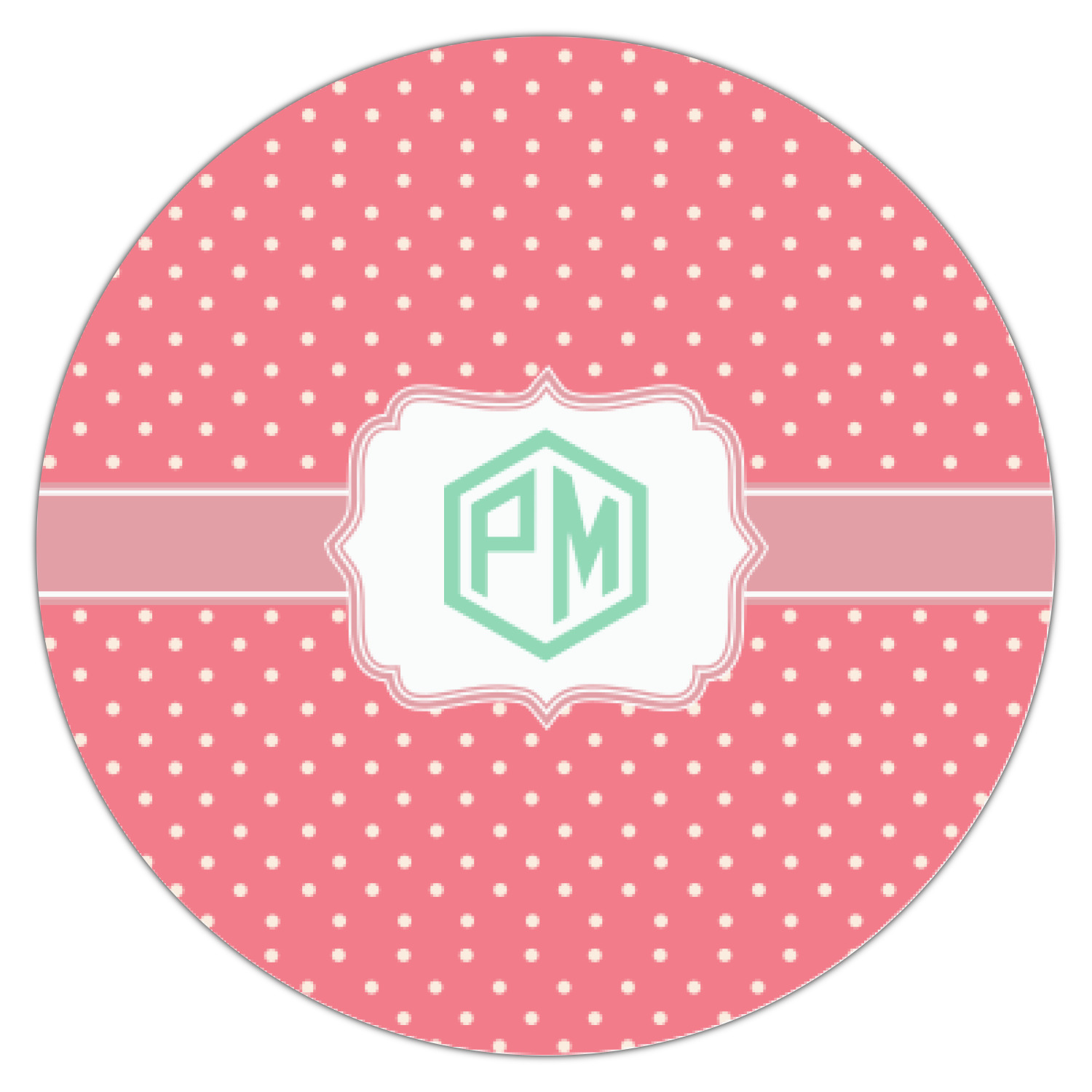 The pixelated chevron stripe pattern alternates between the hot pink and orange. The design has a classic ribbon in hot pink with white stripes. The decorative rectangular label is also in hot pink and white. The personalization is the gorgeous interlocking monogram in hot pink to pull the entire design together.
