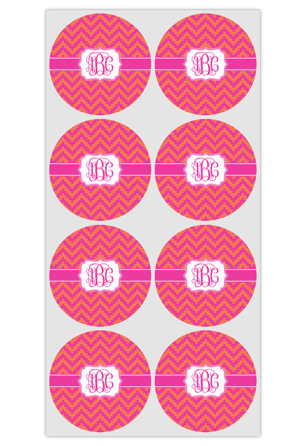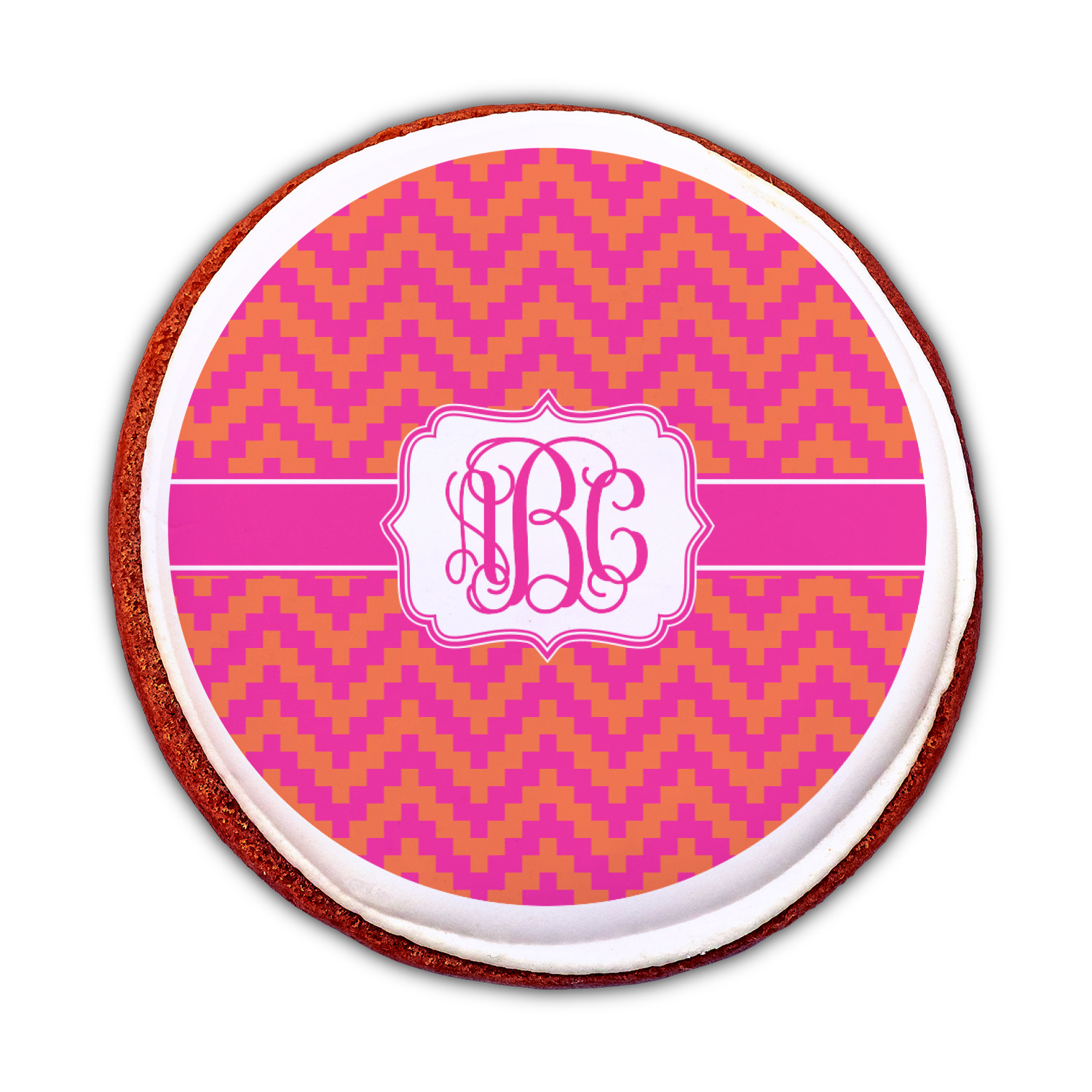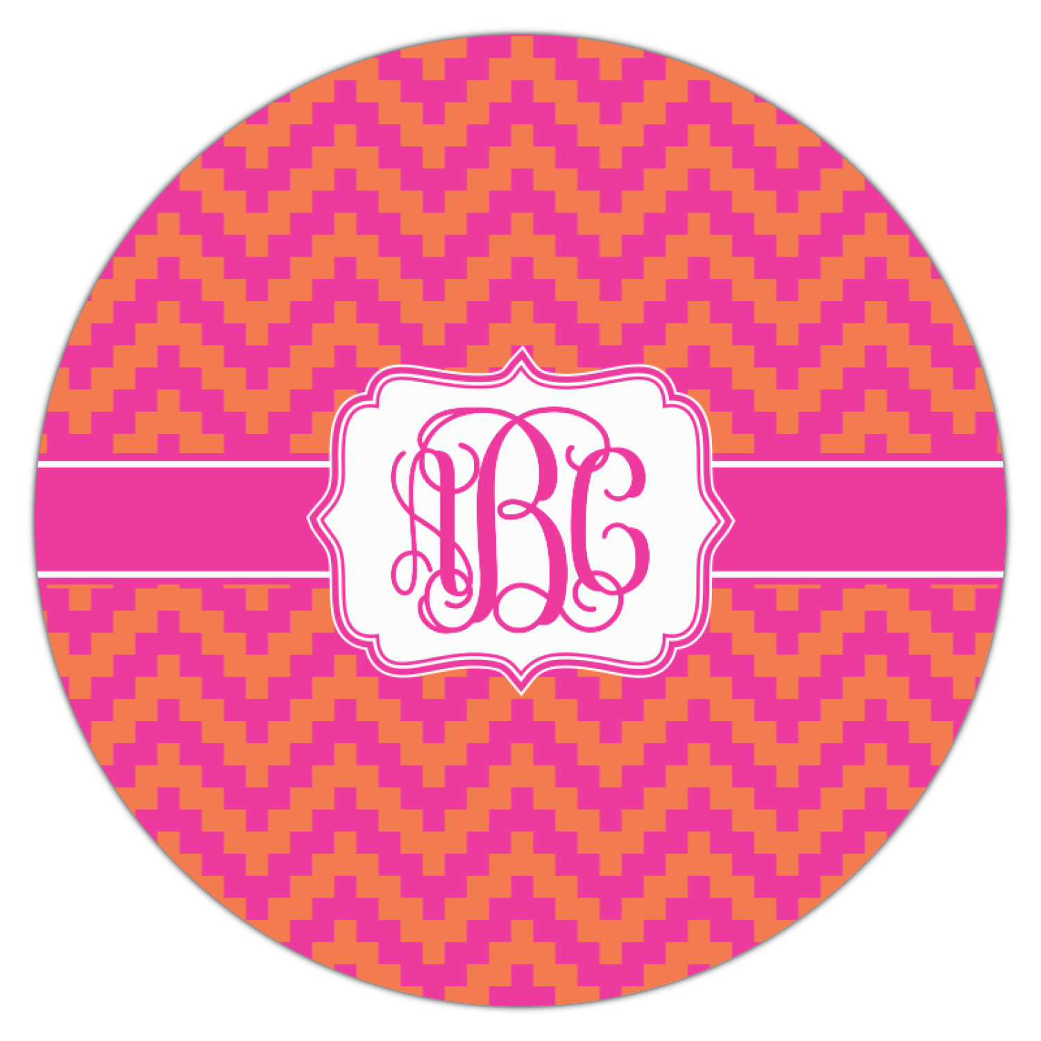 The pixelated chevron stripe pattern alternates between the hot pink and orange. The design has a classic ribbon in hot pink with white stripes. The decorative rectangular label is also in hot pink and white. The personalization is the gorgeous interlocking monogram in hot pink to pull the entire design together.