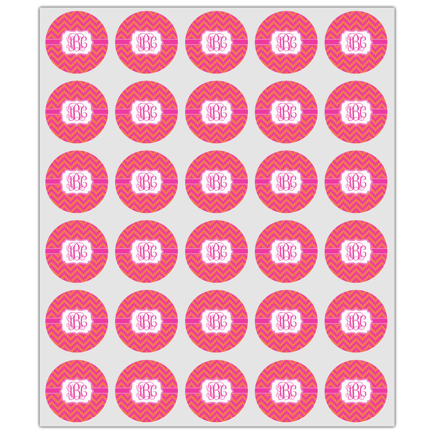 The pixelated chevron stripe pattern alternates between the hot pink and orange. The design has a classic ribbon in hot pink with white stripes. The decorative rectangular label is also in hot pink and white. The personalization is the gorgeous interlocking monogram in hot pink to pull the entire design together.