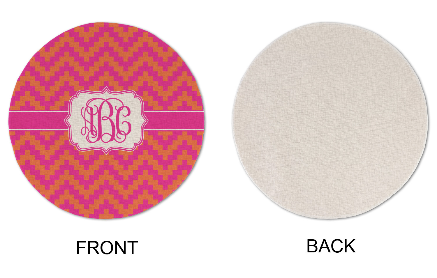 The pixelated chevron stripe pattern alternates between the hot pink and orange. The design has a classic ribbon in hot pink with white stripes. The decorative rectangular label is also in hot pink and white. The personalization is the gorgeous interlocking monogram in hot pink to pull the entire design together.