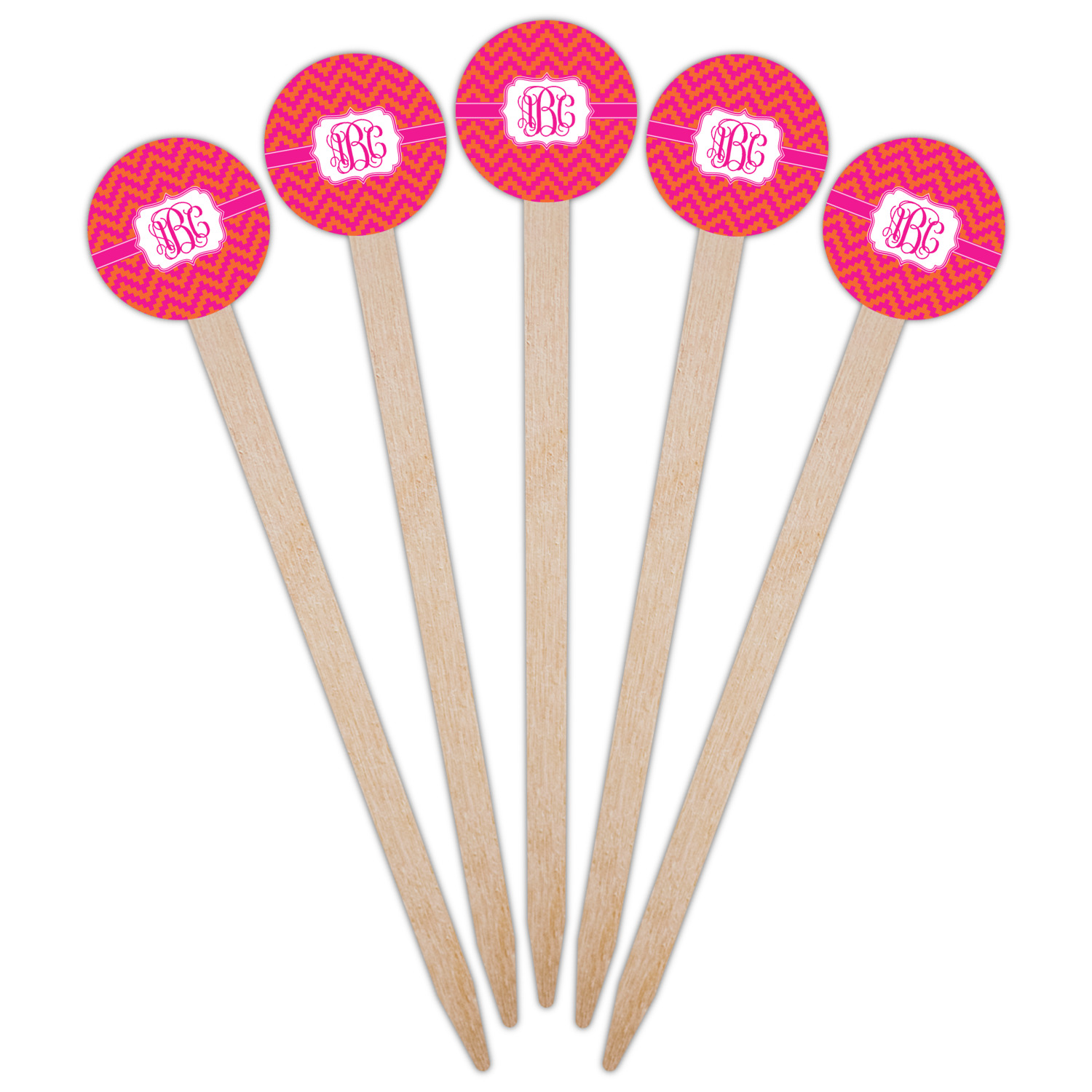 The pixelated chevron stripe pattern alternates between the hot pink and orange. The design has a classic ribbon in hot pink with white stripes. The decorative rectangular label is also in hot pink and white. The personalization is the gorgeous interlocking monogram in hot pink to pull the entire design together.