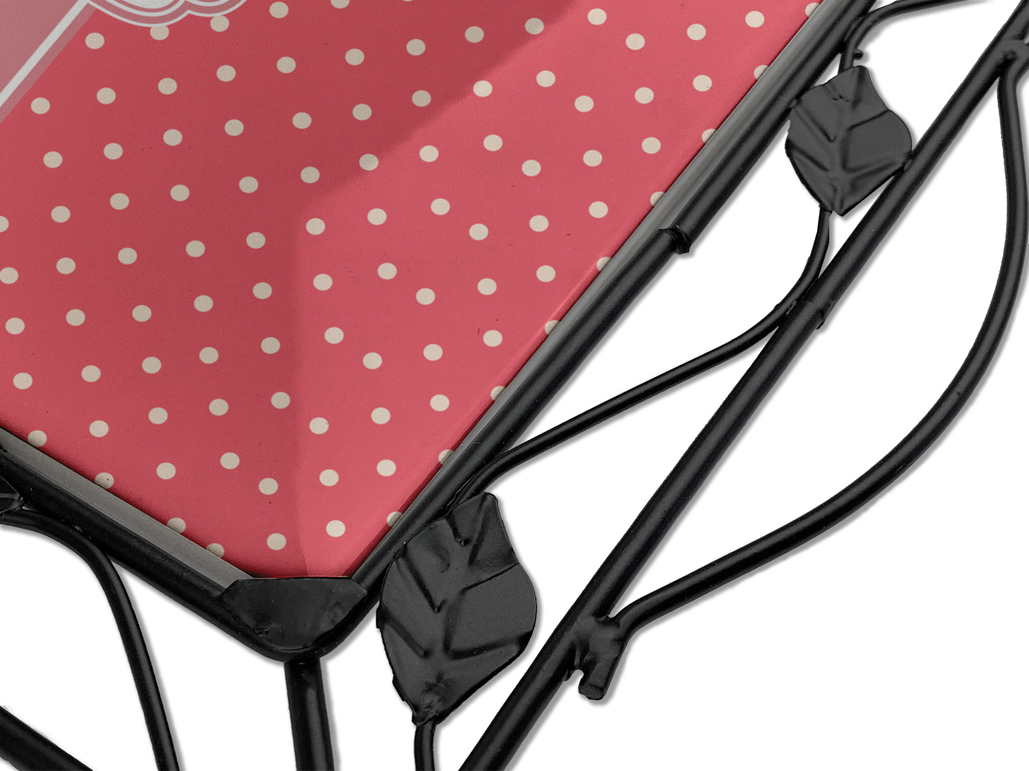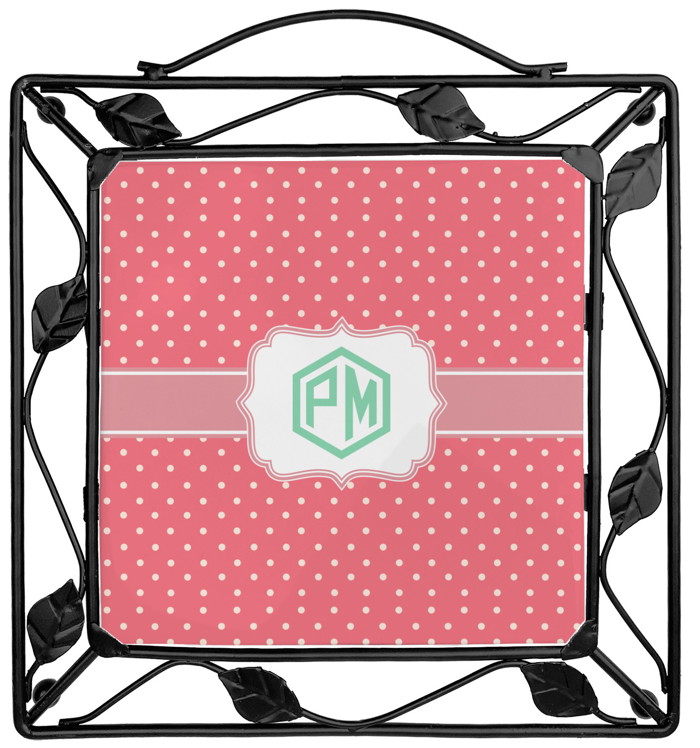 Our square trivets are made from a durable, wrought iron. This model features 4 small half circles, one on each corner, and a larger ring of iron that circles the central, customized tile. Each of the 4 corners has a round foot on its bottom for stability. This trivet is 8.75 by 8.75 inches, but the central tile measures at 6 inches on both sides.