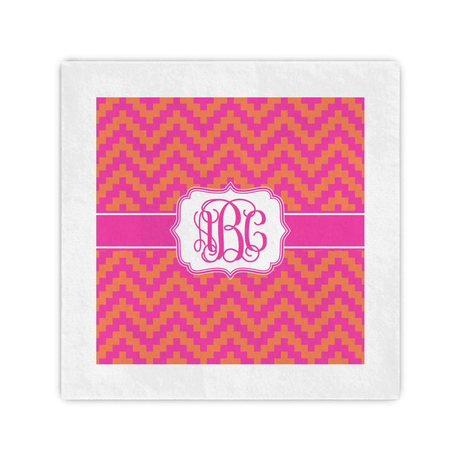 The pixelated chevron stripe pattern alternates between the hot pink and orange. The design has a classic ribbon in hot pink with white stripes. The decorative rectangular label is also in hot pink and white. The personalization is the gorgeous interlocking monogram in hot pink to pull the entire design together.