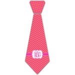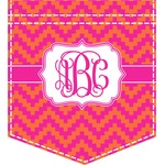 The pixelated chevron stripe pattern alternates between the hot pink and orange. The design has a classic ribbon in hot pink with white stripes. The decorative rectangular label is also in hot pink and white. The personalization is the gorgeous interlocking monogram in hot pink to pull the entire design together.