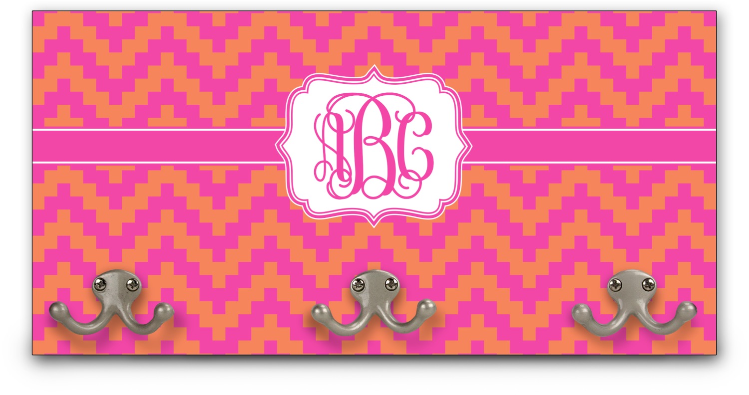 The pixelated chevron stripe pattern alternates between the hot pink and orange. The design has a classic ribbon in hot pink with white stripes. The decorative rectangular label is also in hot pink and white. The personalization is the gorgeous interlocking monogram in hot pink to pull the entire design together.
