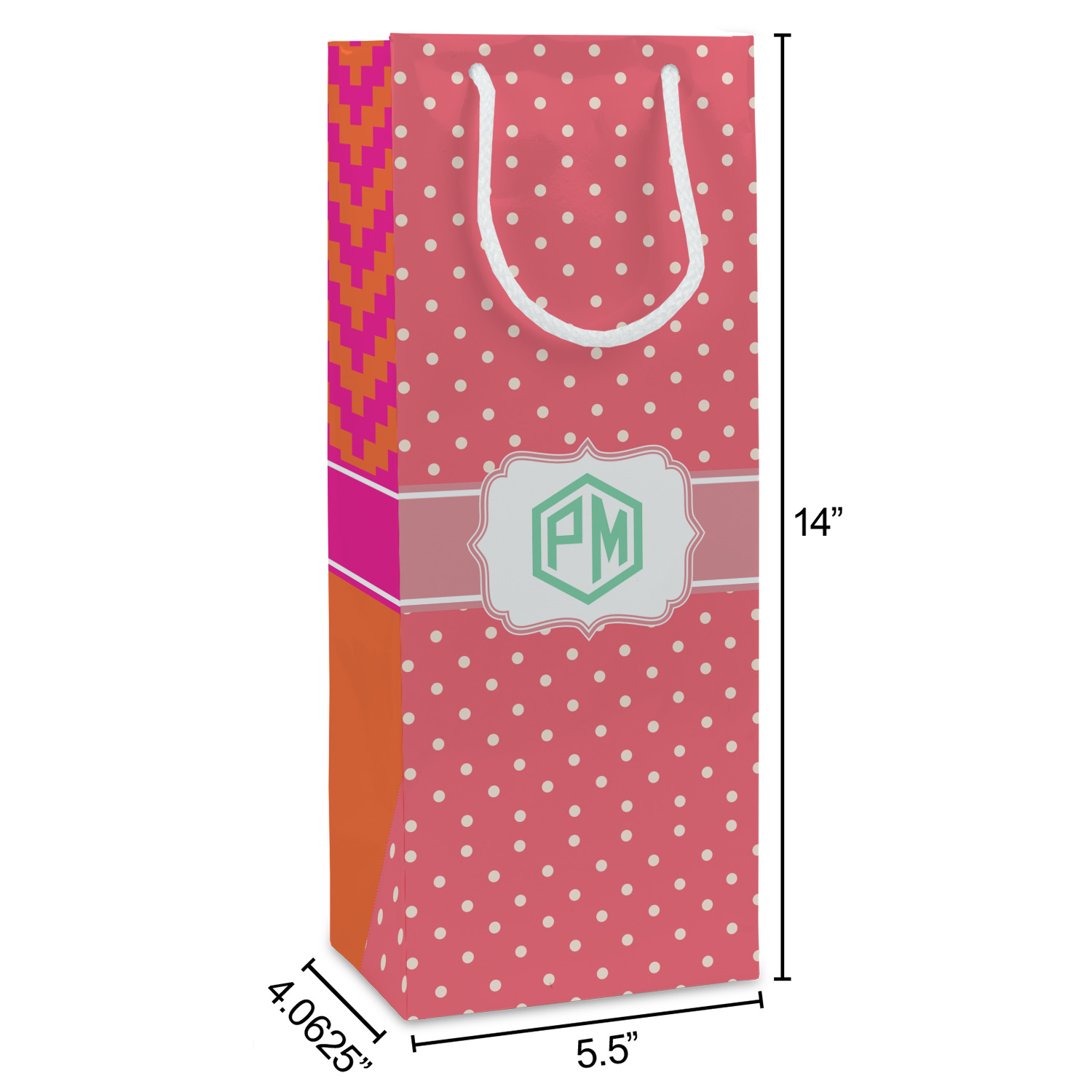 The pixelated chevron stripe pattern alternates between the hot pink and orange. The design has a classic ribbon in hot pink with white stripes. The decorative rectangular label is also in hot pink and white. The personalization is the gorgeous interlocking monogram in hot pink to pull the entire design together.
