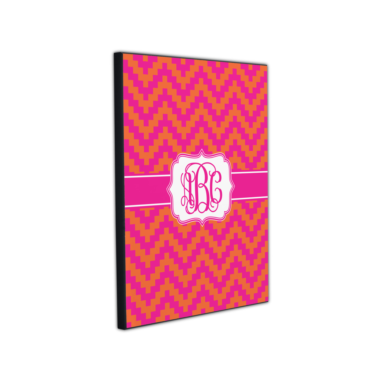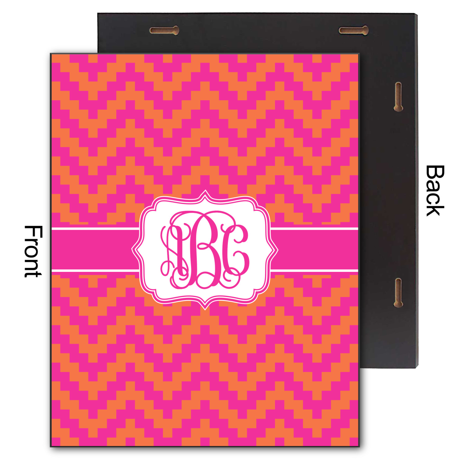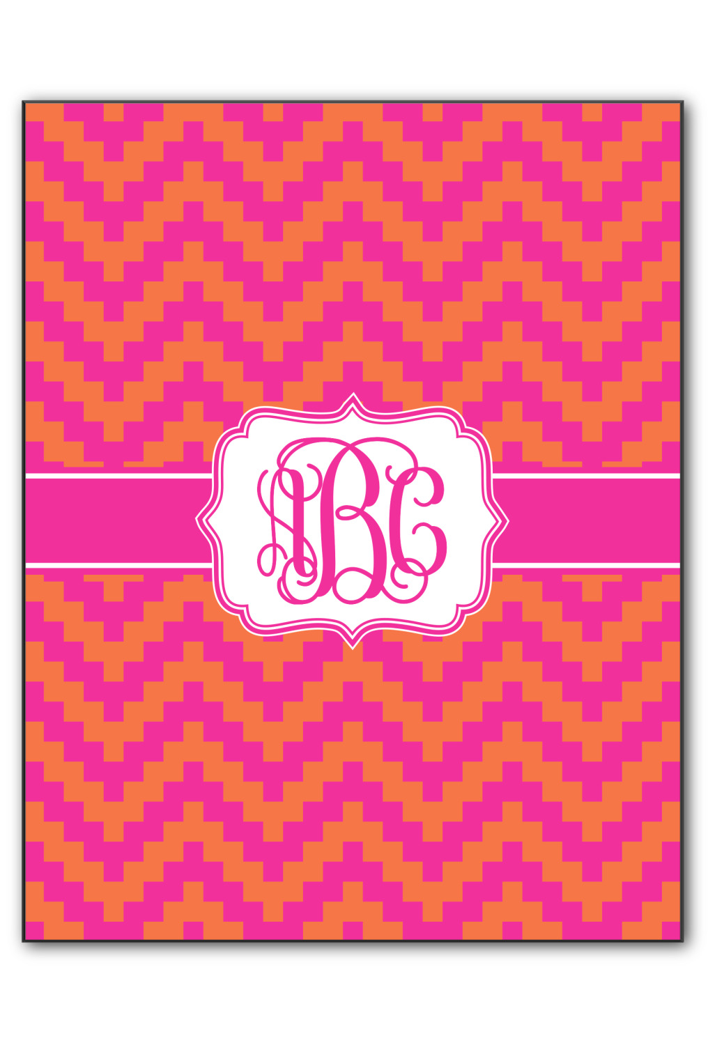 The pixelated chevron stripe pattern alternates between the hot pink and orange. The design has a classic ribbon in hot pink with white stripes. The decorative rectangular label is also in hot pink and white. The personalization is the gorgeous interlocking monogram in hot pink to pull the entire design together.