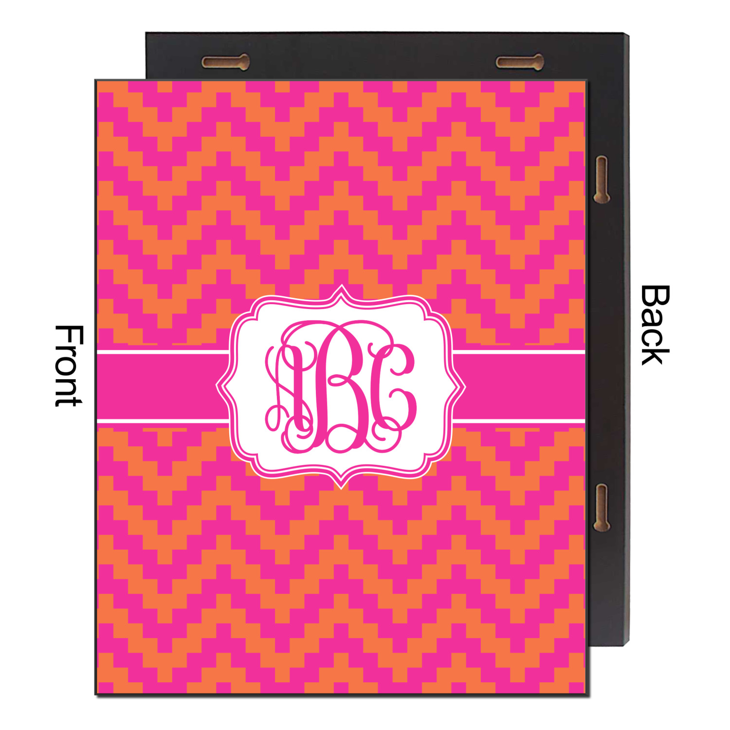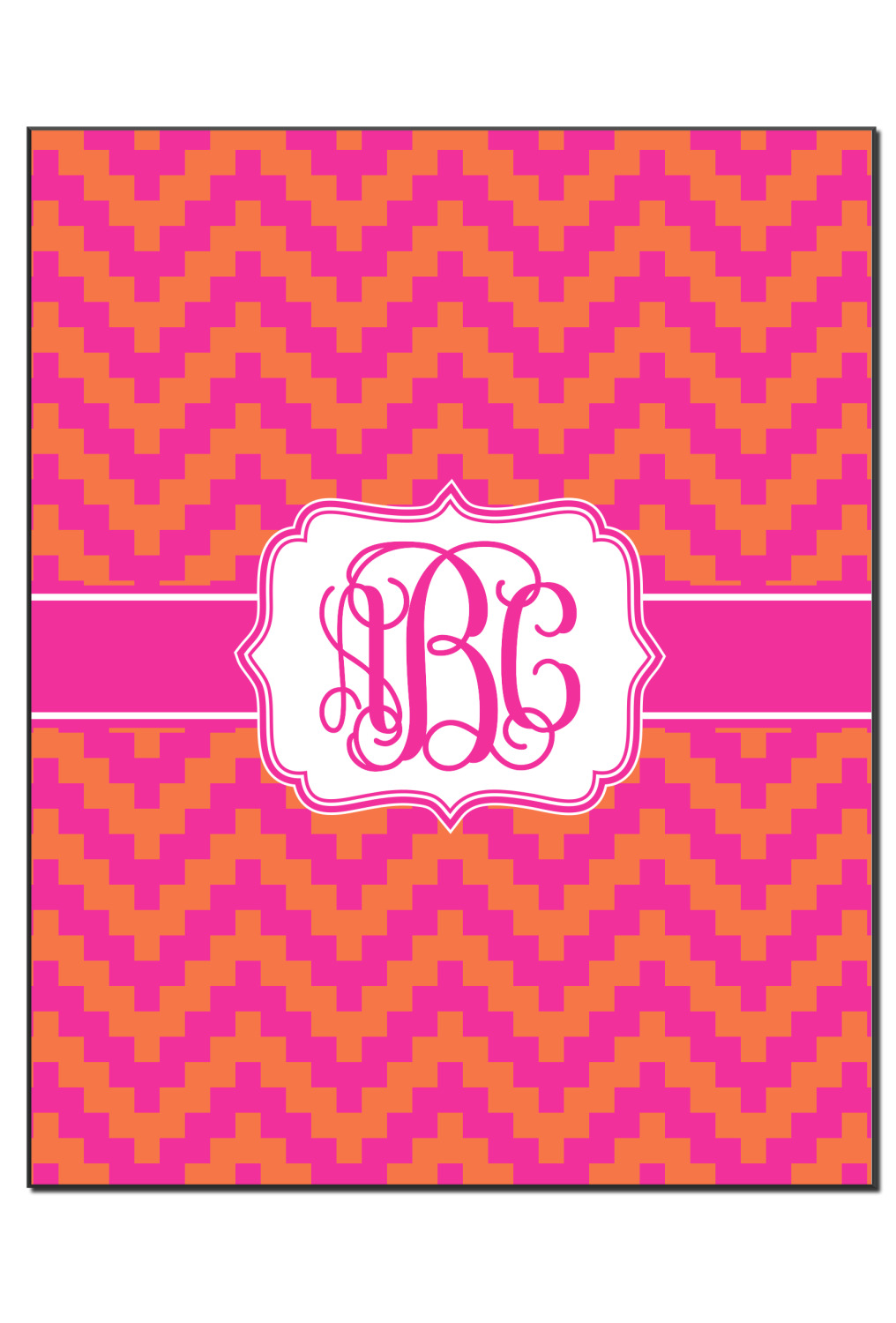 The pixelated chevron stripe pattern alternates between the hot pink and orange. The design has a classic ribbon in hot pink with white stripes. The decorative rectangular label is also in hot pink and white. The personalization is the gorgeous interlocking monogram in hot pink to pull the entire design together.