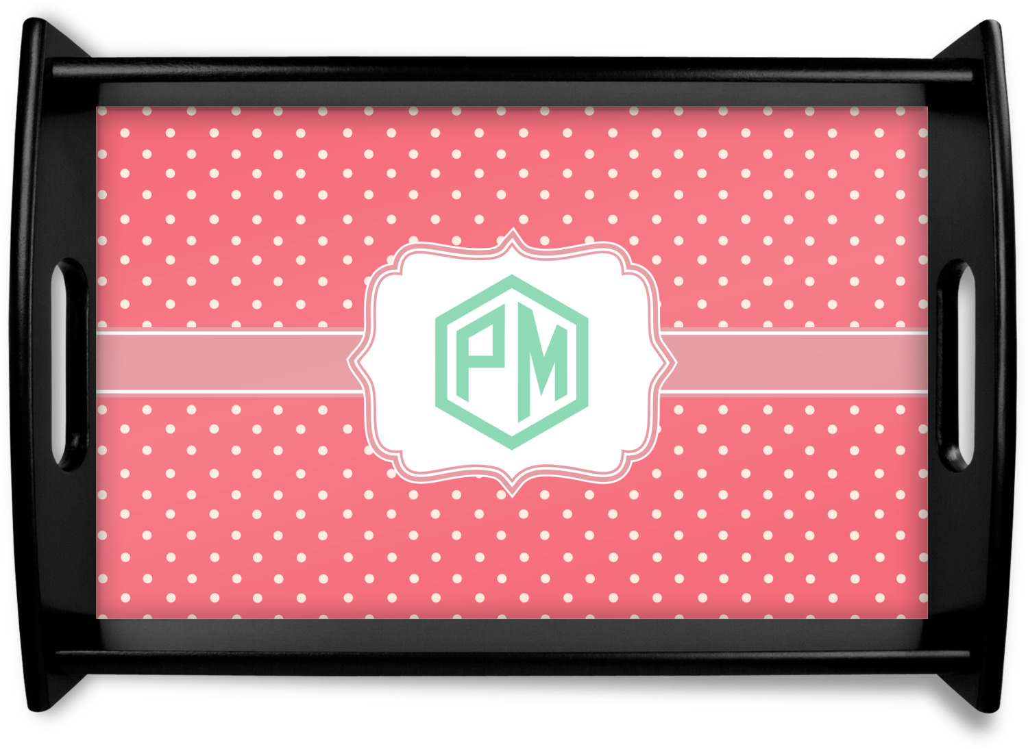 This serving tray with handles features square edges and two rounded sides, creating a very modern look. Each side is fabricated from a beautifully cut, natural wood. The bottom of the interior of the tray displays your customized design in bright, vibrant color. The tray is sold in both a black color and a natural wood look. Each variation of the wood serving tray has two sizes: Small, which is 14" x 10" x 2.25", and Large, which is 19.5" x 13.5" x 2.75".