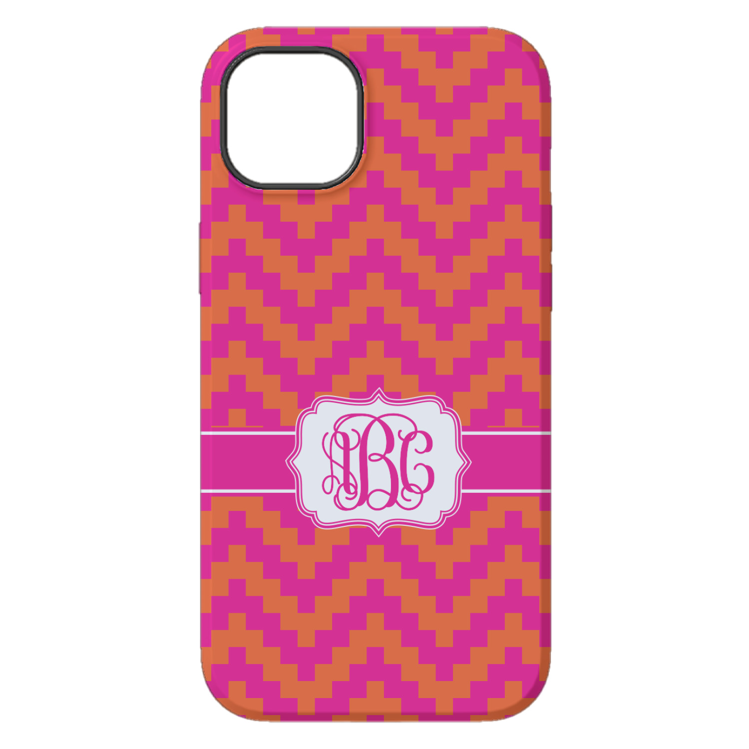 The pixelated chevron stripe pattern alternates between the hot pink and orange. The design has a classic ribbon in hot pink with white stripes. The decorative rectangular label is also in hot pink and white. The personalization is the gorgeous interlocking monogram in hot pink to pull the entire design together.
