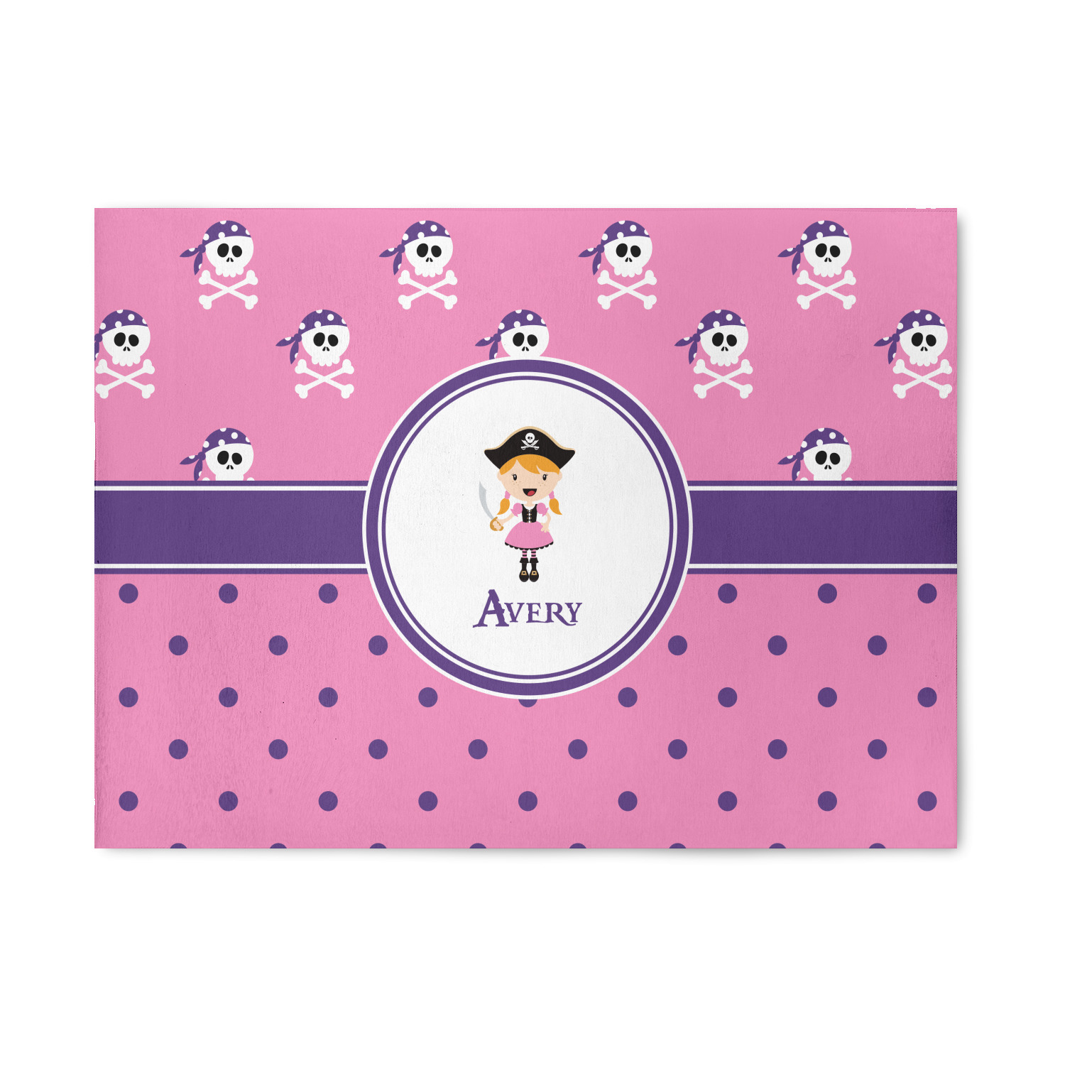 A wide band of purple, trimmed in white, highlight the little pirate girl in the white circle label that is trimmed in the coordinating purple color. Add your personalization in the label to complete the look.