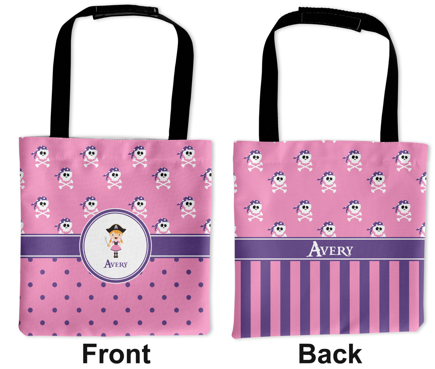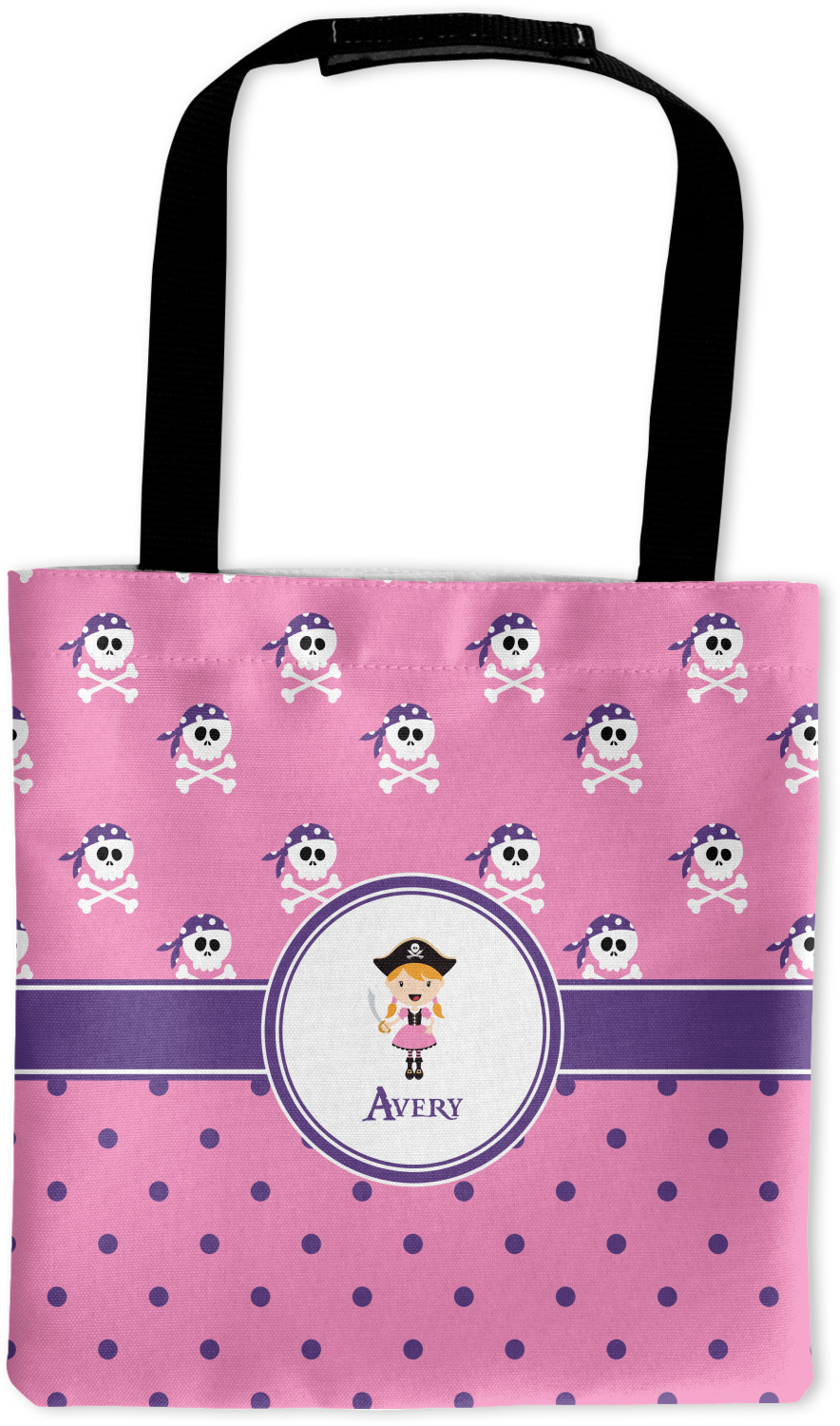 A wide band of purple, trimmed in white, highlight the little pirate girl in the white circle label that is trimmed in the coordinating purple color. Add your personalization in the label to complete the look.