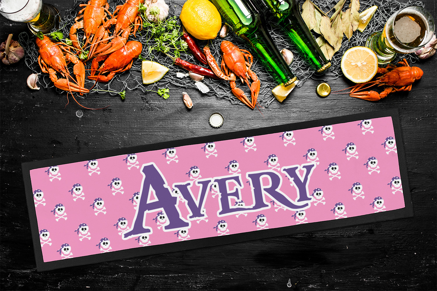 A wide band of purple, trimmed in white, highlight the little pirate girl in the white circle label that is trimmed in the coordinating purple color. Add your personalization in the label to complete the look.