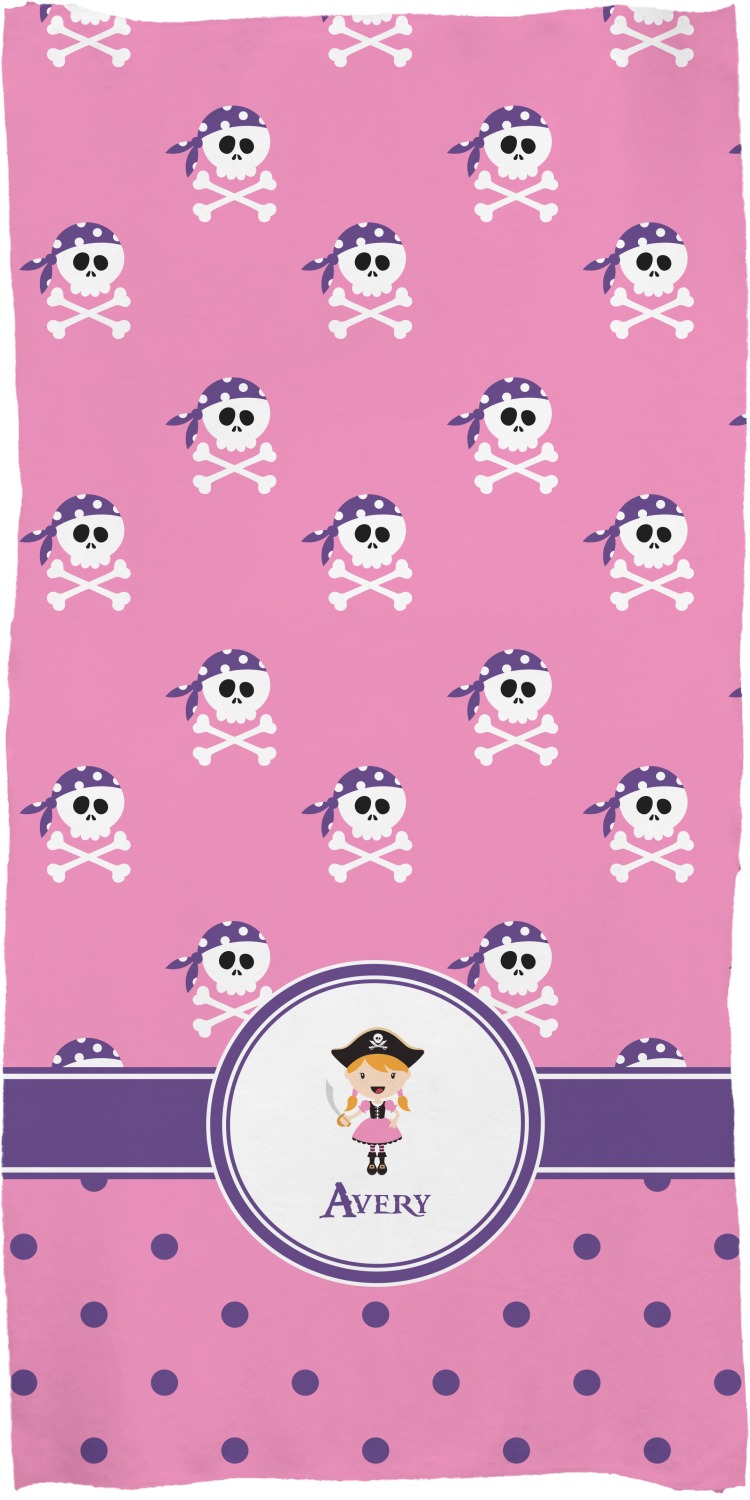 A wide band of purple, trimmed in white, highlight the little pirate girl in the white circle label that is trimmed in the coordinating purple color. Add your personalization in the label to complete the look.