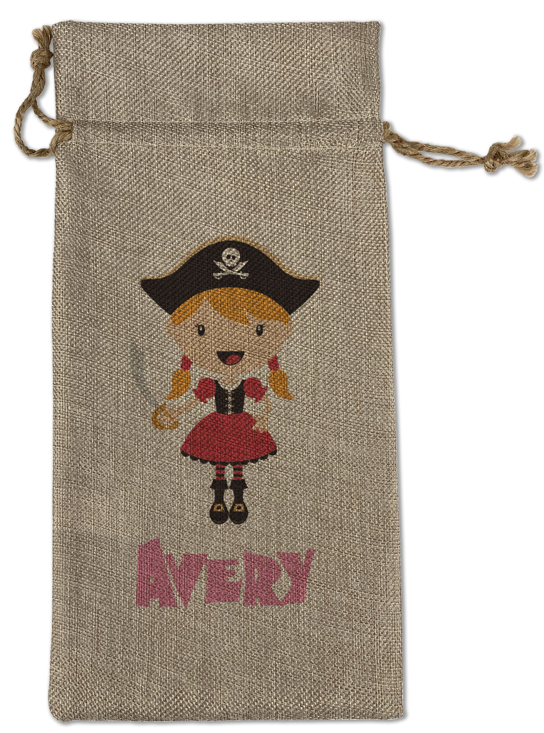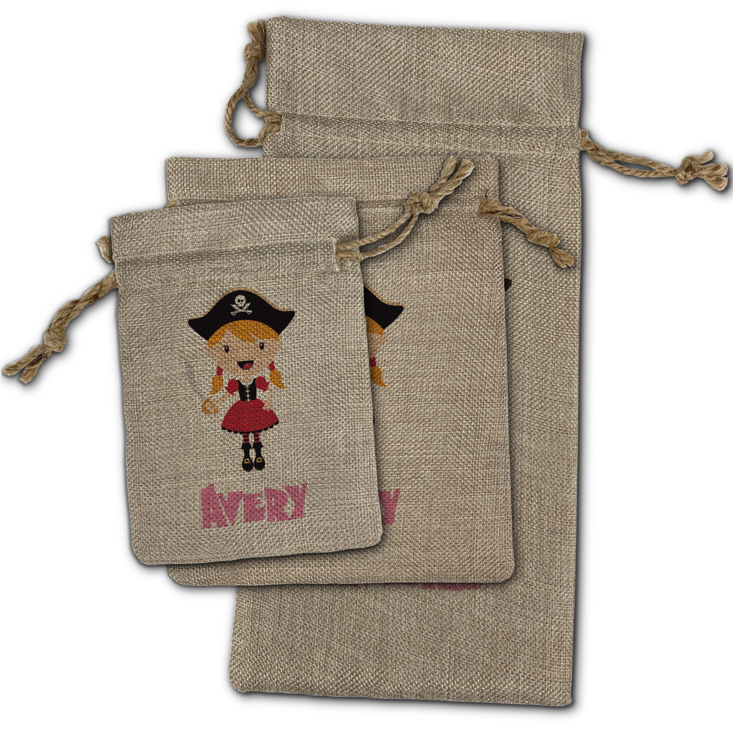 We sell our Burlap Gift Bags in 3 variant sized bags. Made with burlap polyester, each personalized bag can be secured with a twine drawstring pull. Your custom design is available to print on one side or both sides - completely up to you! The sizes of the bags measure approximately 4.5" x 6.5" for the smallest size, 6.5" x 8.0" for the medium size, and 6.5" x 13.5" for the large-sized bag.