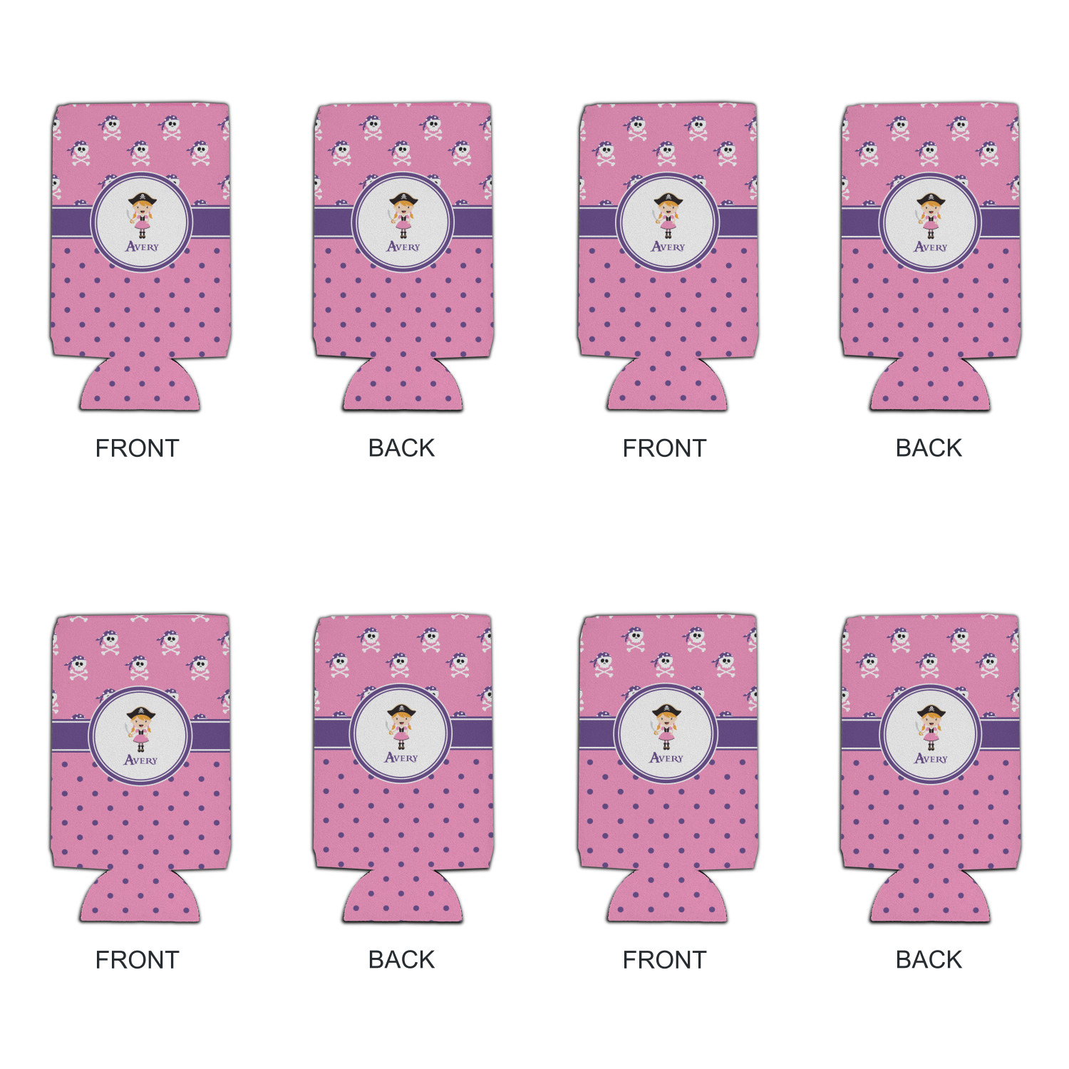 A wide band of purple, trimmed in white, highlight the little pirate girl in the white circle label that is trimmed in the coordinating purple color. Add your personalization in the label to complete the look.