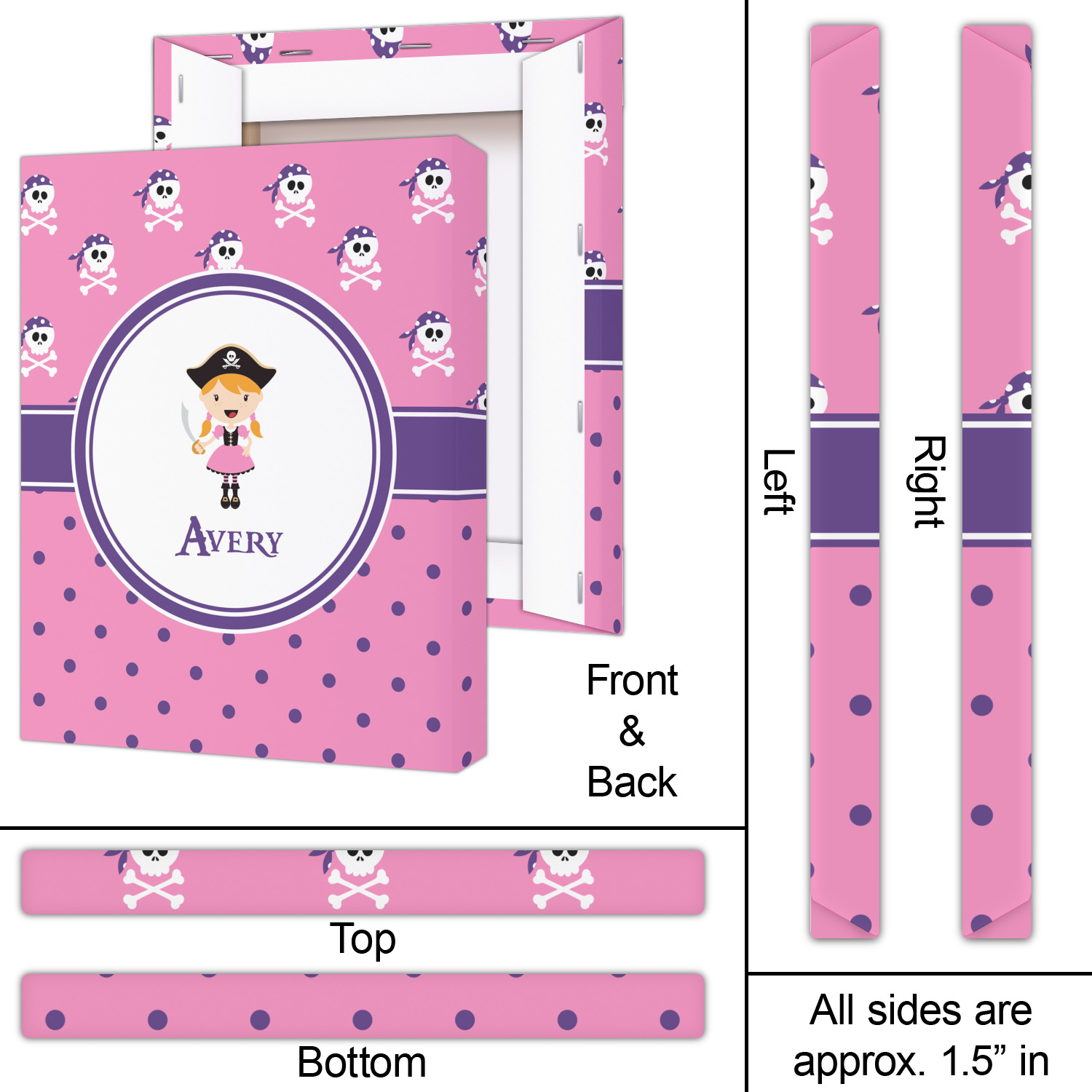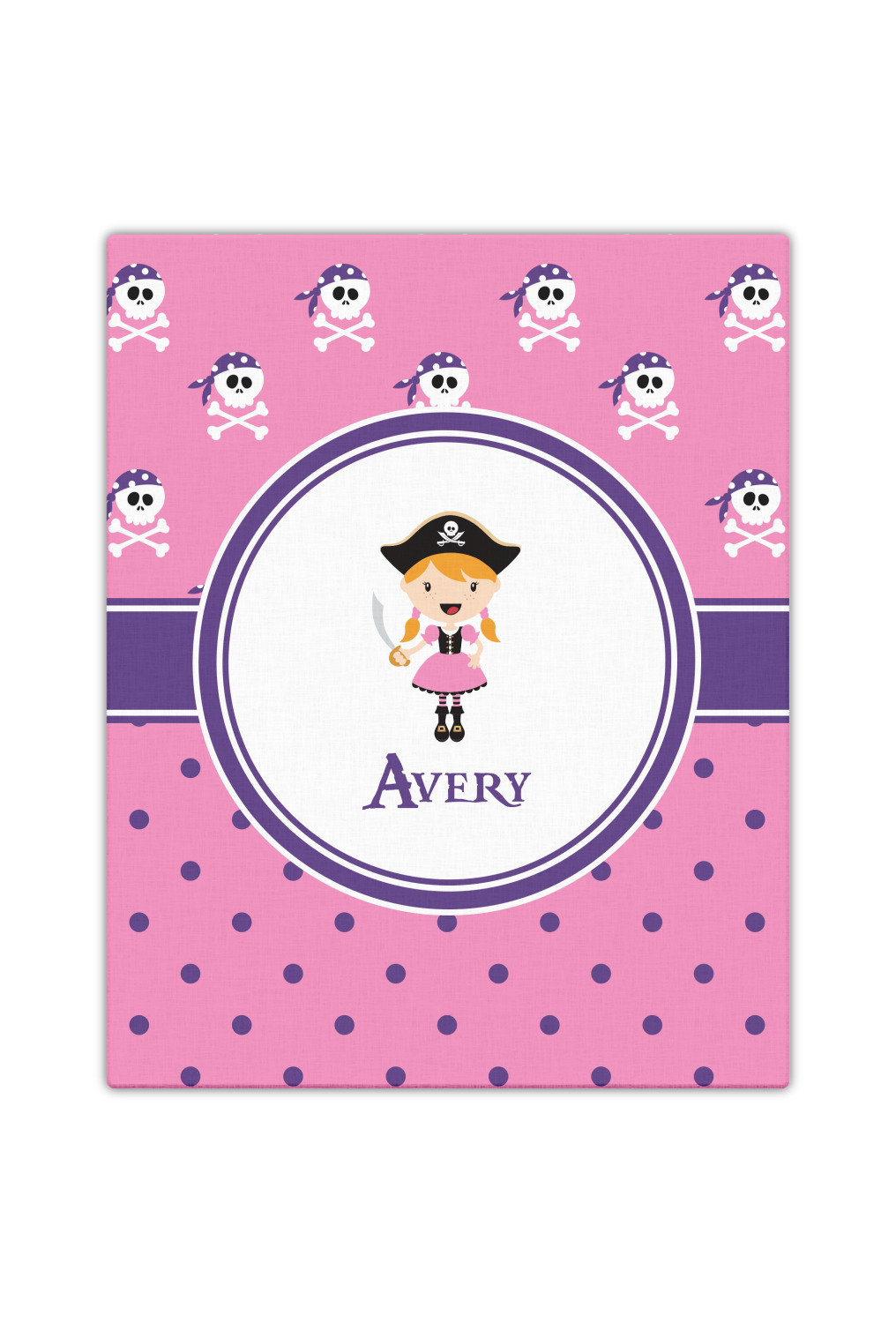 A wide band of purple, trimmed in white, highlight the little pirate girl in the white circle label that is trimmed in the coordinating purple color. Add your personalization in the label to complete the look.