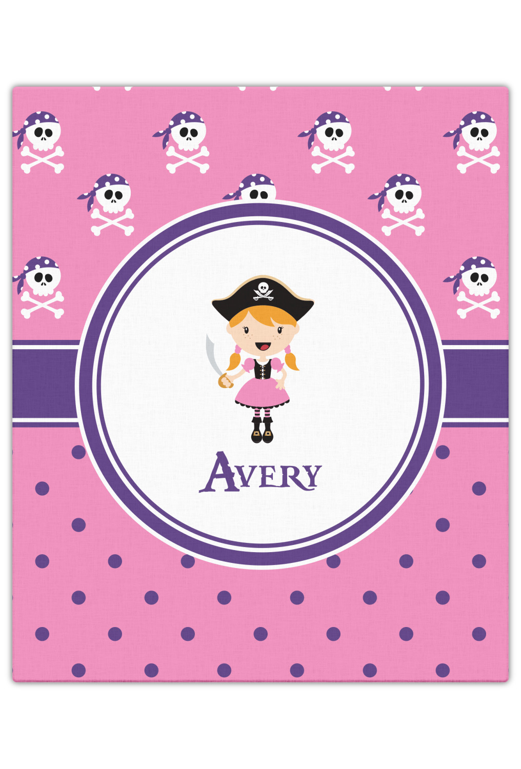 A wide band of purple, trimmed in white, highlight the little pirate girl in the white circle label that is trimmed in the coordinating purple color. Add your personalization in the label to complete the look.