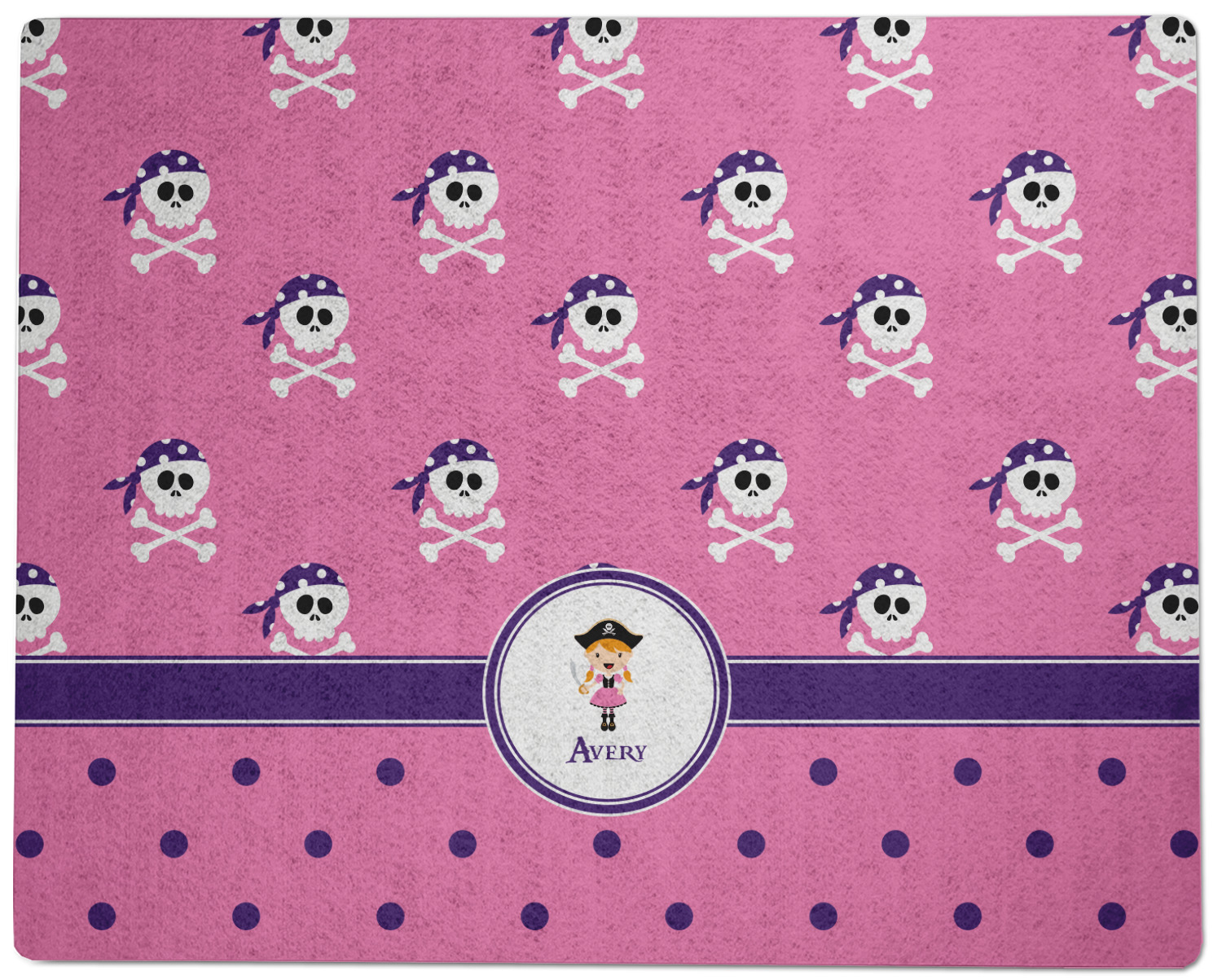 A wide band of purple, trimmed in white, highlight the little pirate girl in the white circle label that is trimmed in the coordinating purple color. Add your personalization in the label to complete the look.