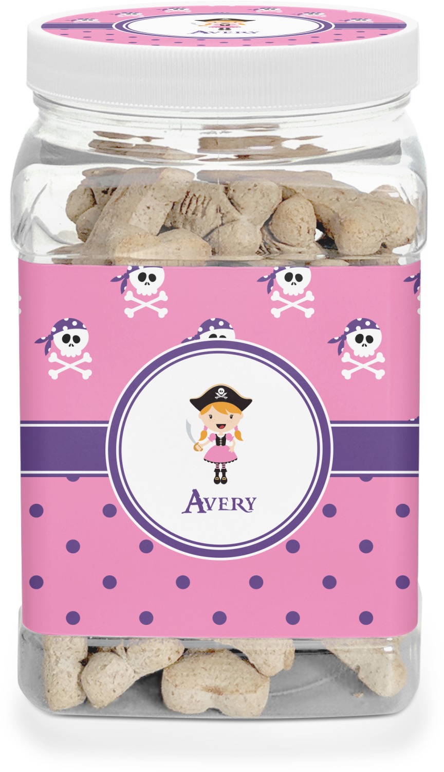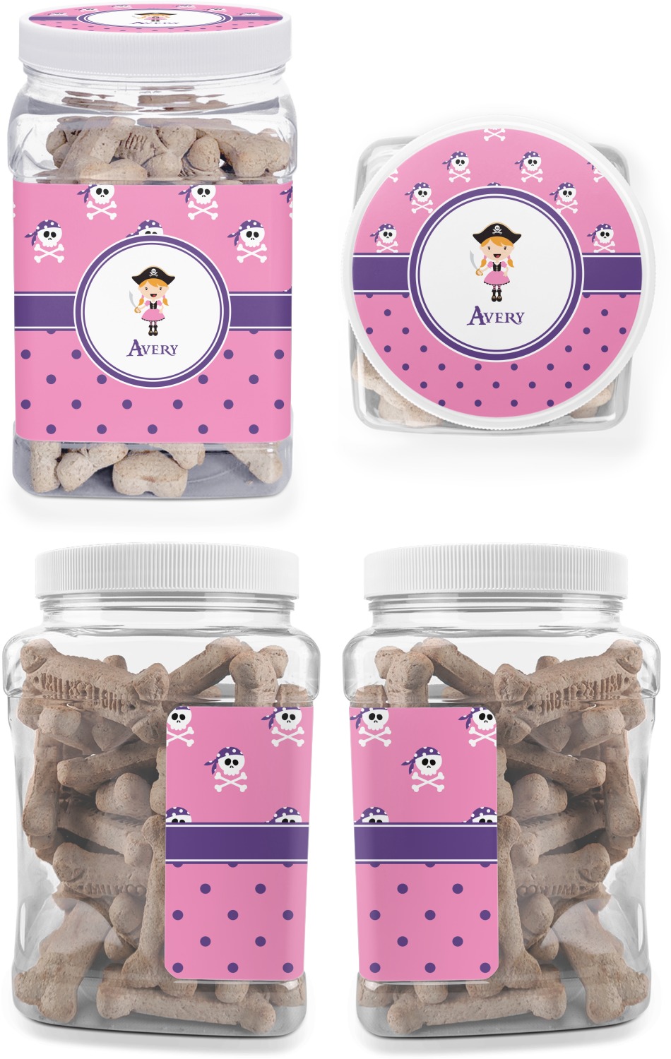 This half gallon jar, made from a sturdy plastic, is the perfect way to keep treats from any naughty pet paws, while still keeping them ready on hand for when your pup performs an impressive trick. This dog cookie jar features a screw-on, white lid that displays your personalized design on a vinyl sticker. We apply another customized sticker that wraps around the front and sides of the jar. Our dog treat jar also has indentations on the rear ends of the sides, which allows for convenient handling, and its square frame allows for easy storage.