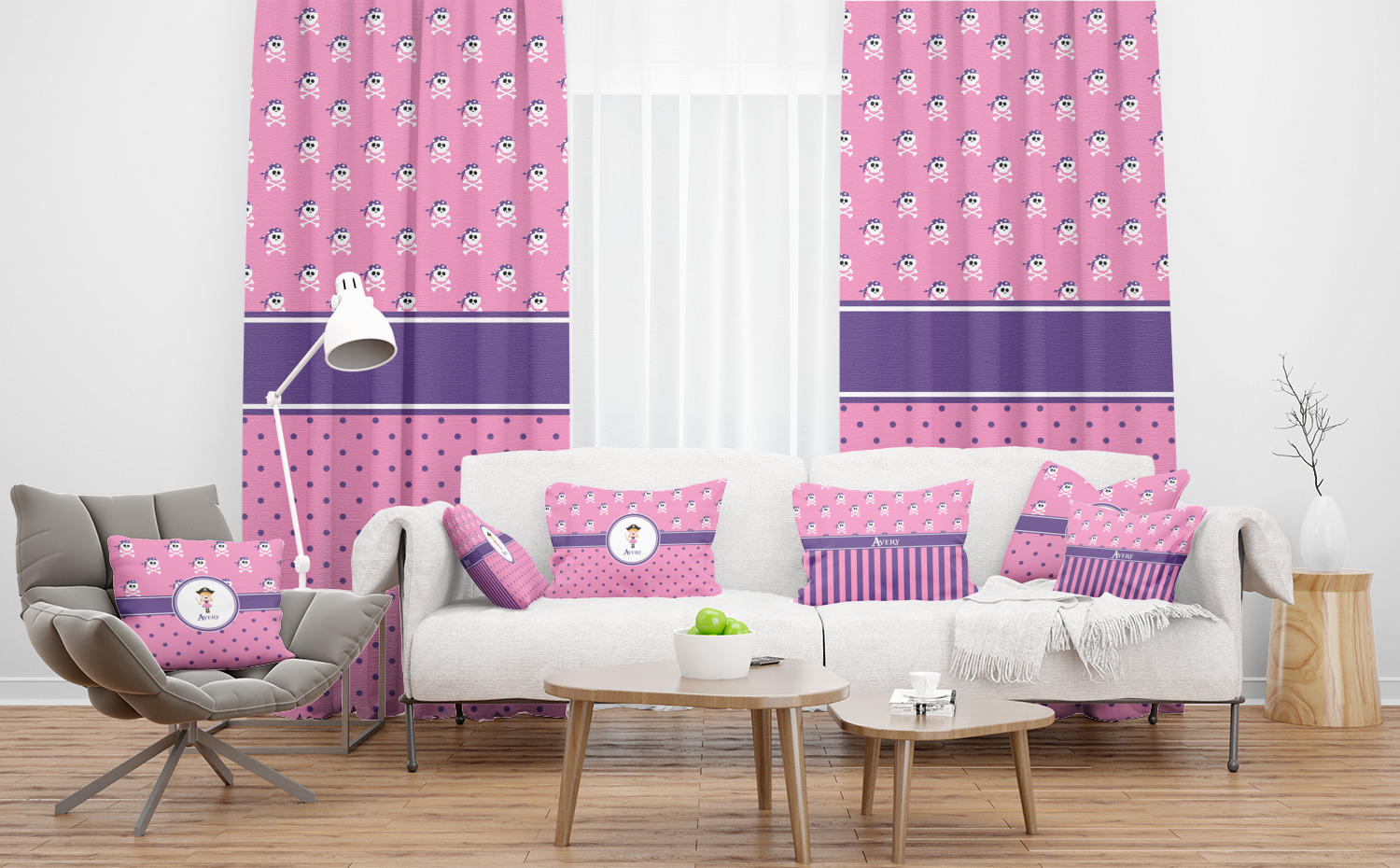 A wide band of purple, trimmed in white, highlight the little pirate girl in the white circle label that is trimmed in the coordinating purple color. Add your personalization in the label to complete the look.