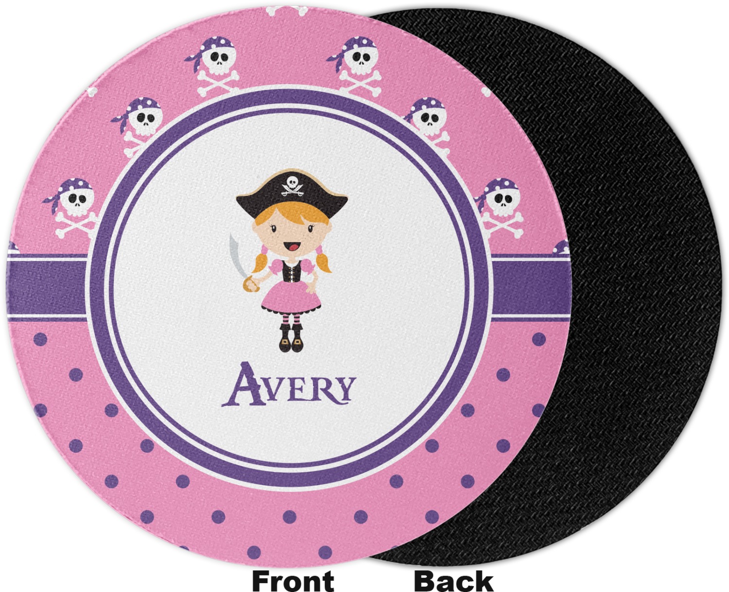 A wide band of purple, trimmed in white, highlight the little pirate girl in the white circle label that is trimmed in the coordinating purple color. Add your personalization in the label to complete the look.