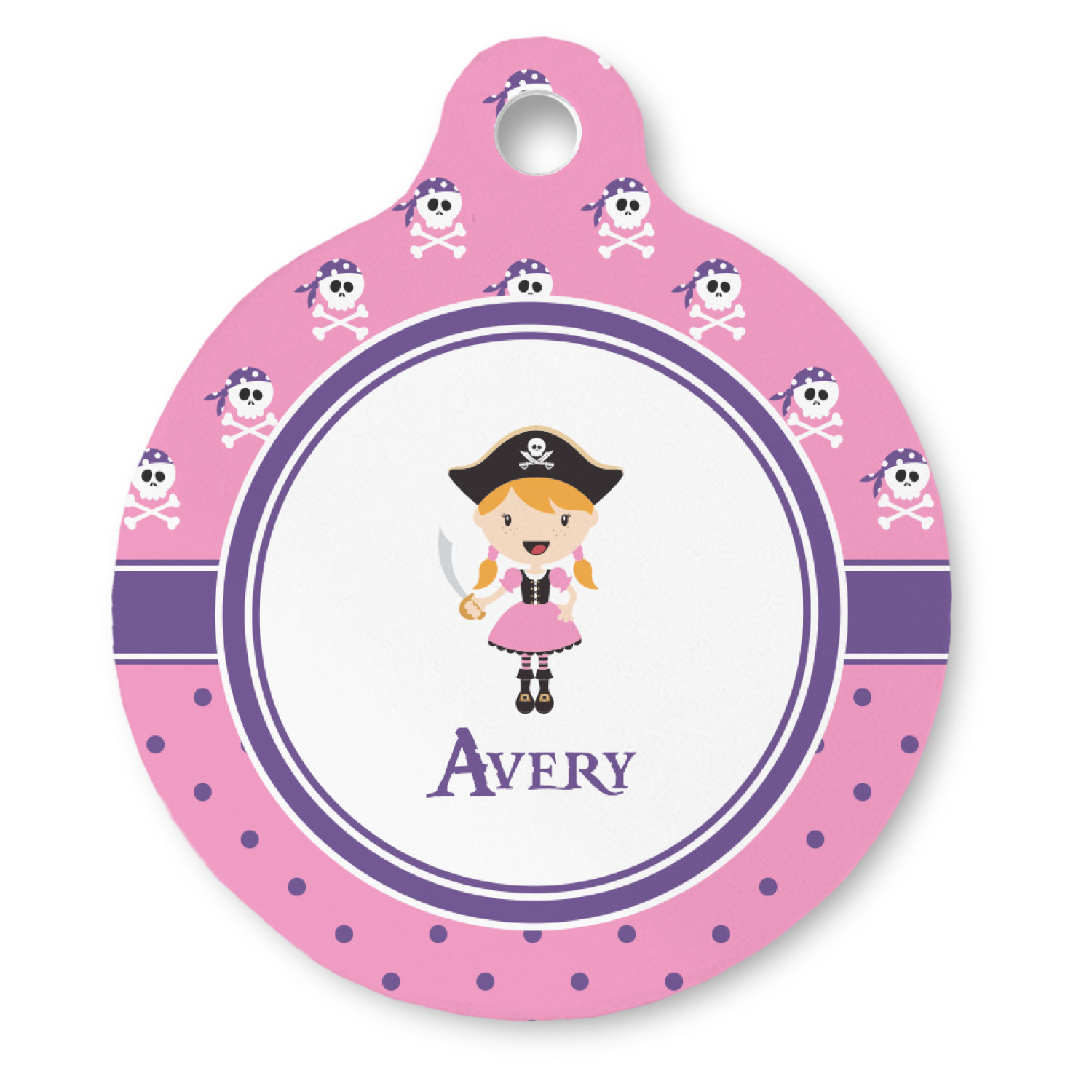 A wide band of purple, trimmed in white, highlight the little pirate girl in the white circle label that is trimmed in the coordinating purple color. Add your personalization in the label to complete the look.