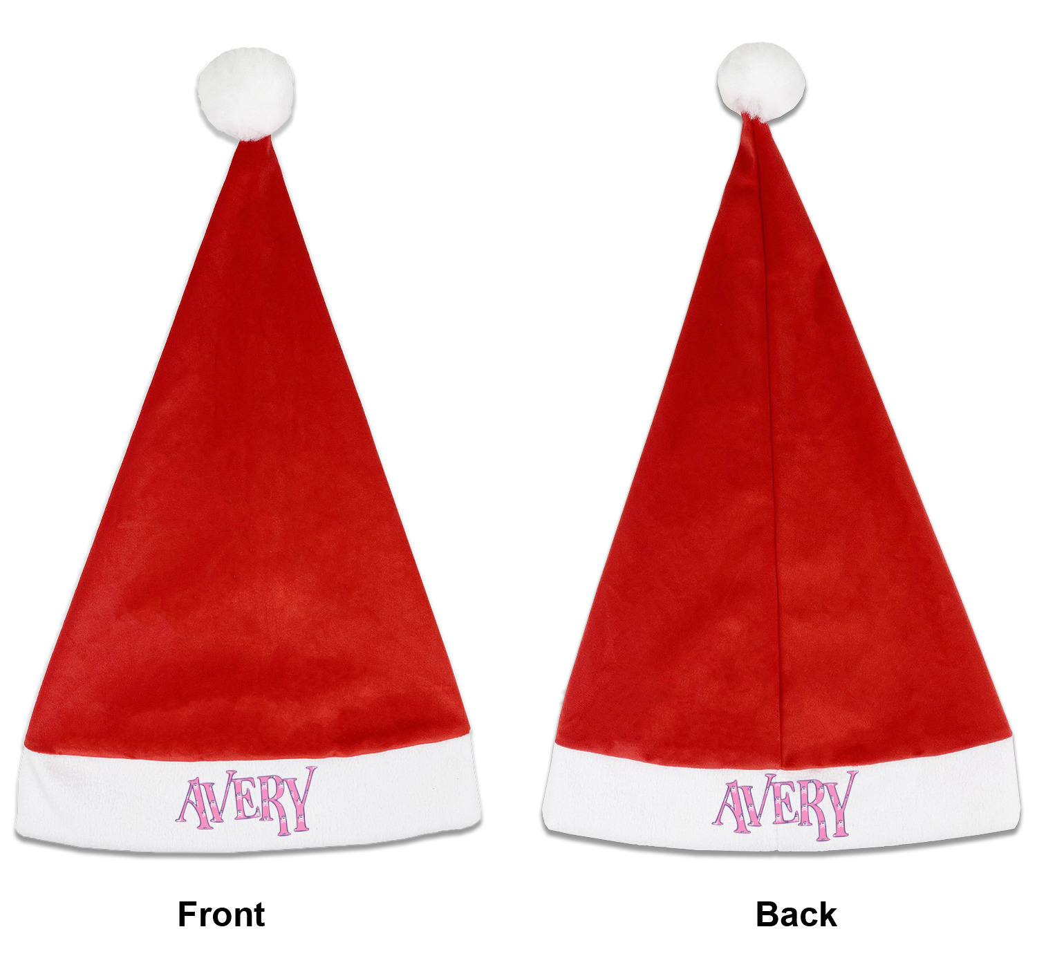 Our Santa hats are a soft, velvety polyester material. These customizable Santa hats are a classic red with white brimming and pom pom ball hanging off the hat tail just like Santa Claus! Each personalized Santa hat is approximately 17.5 L x 11.8 W. We offer two different styles to print your designs on the white brim - front or front & back.